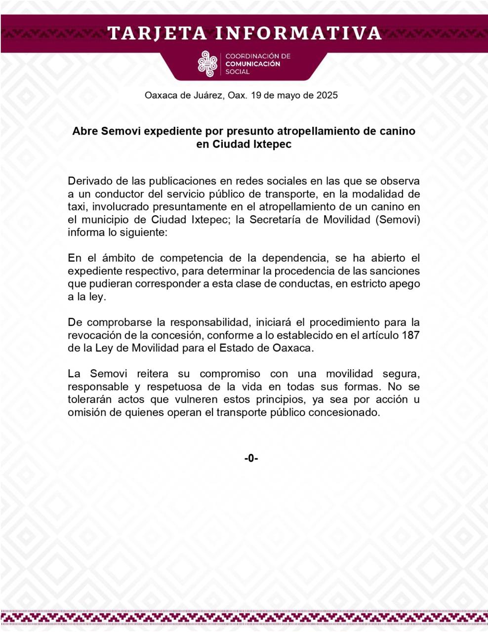 Derivado de las publicaciones en redes sociales en las que se observa a un conductor del servicio público de transporte, en la modalidad de taxi, involucrado presuntamente en el atropellamiento de un canino en el municipio de Ciudad Ixtepec; la Secretaría de Movilidad (Semovi) informa lo siguiente: