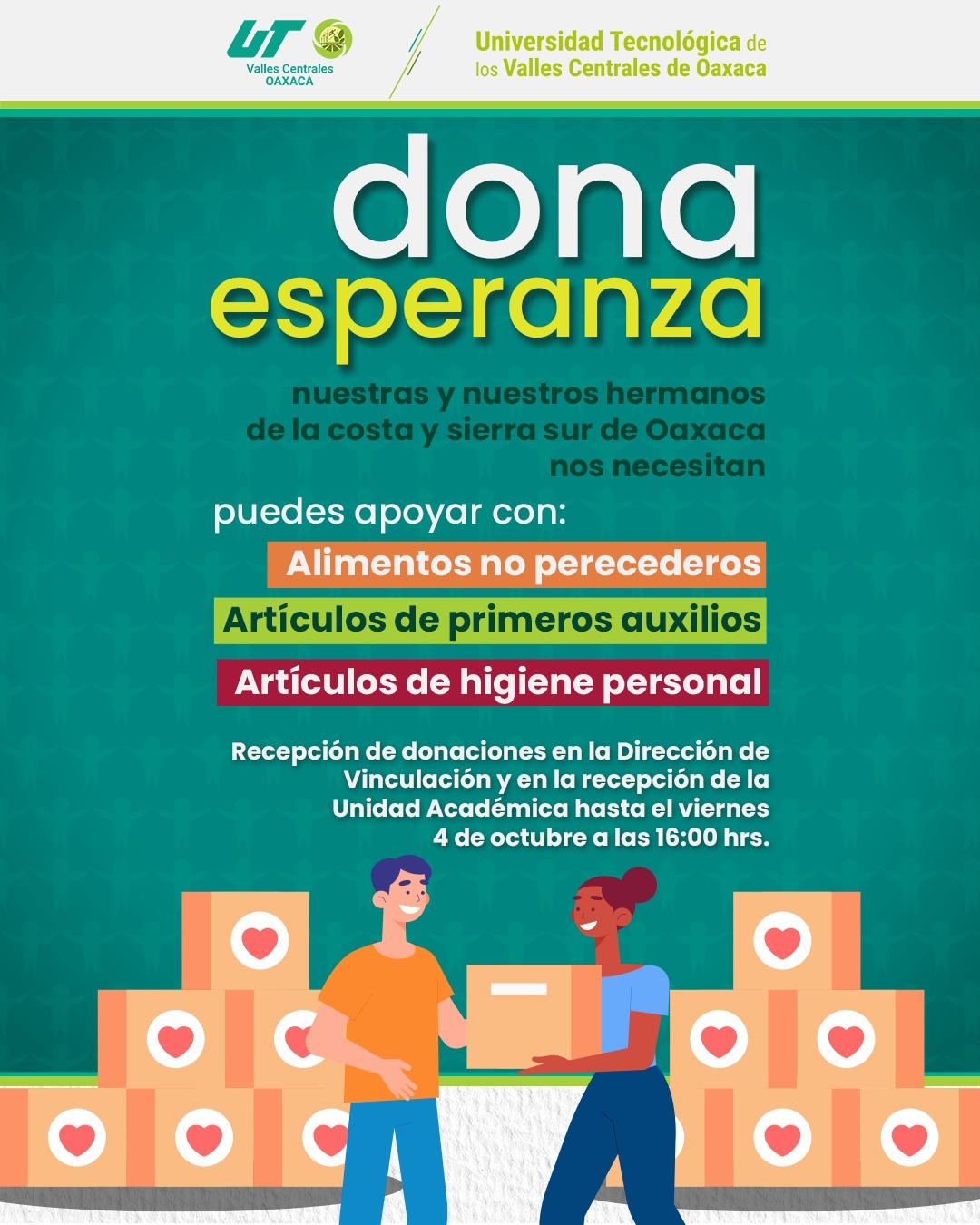 San Pablo Huixtepec, Oax., 1 de octubre de 2024.- La Universidad Tecnológica de los Valles Centrales de Oaxaca (UTVCO) anunció que del 2 al 4 de octubre, abrirá dos centros de acopio para recibir víveres en apoyo a las personas damnificadas por el paso del huracán “John” en el estado, principalmente, a las pertenecientes a las regiones de la Sierra Sur y Costa.