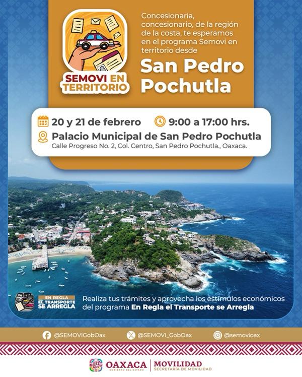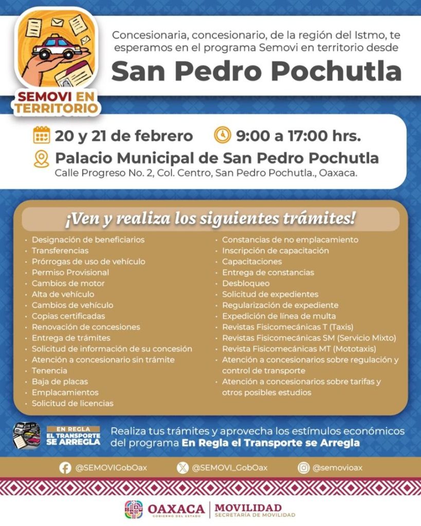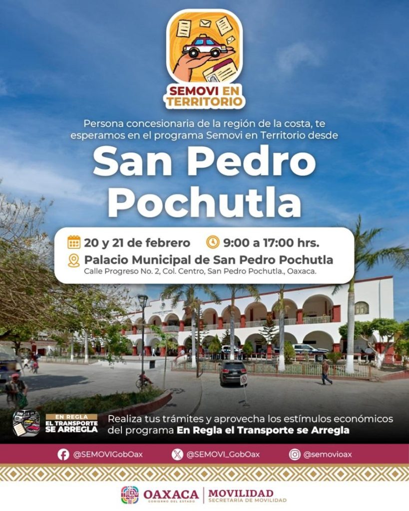 Esta jornada que forma parte del programa “Semovi en Territorio”, se llevará a cabo en el palacio municipal de San Pedro Pochutla, ubicado en la calle Progreso número 2, colonia Centro, en un horario de 9:00 a 17:00 horas.