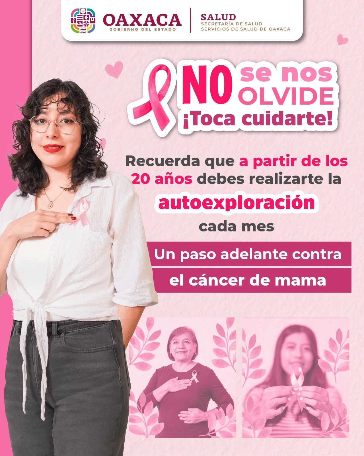 Oaxaca de Juárez, Oax. 1 de octubre de 2024.- Con el fin de evitar factores de riesgo e invitar a las oaxaqueñas a la acción para una detección y tratamiento oportuno, Servicios de Salud de Oaxaca (SSO) lanzan la campaña No se nos olvide ¡Toca Cuidarte!, en el marco de octubre rosa, mes de la concientización del cáncer de mama.