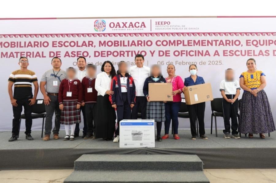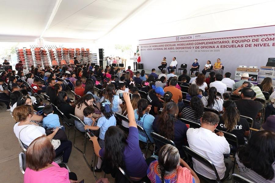 Oaxaca de Juárez, Oax. 6 de febrero de 2025.- Con una inversión histórica de más de 38 millones 531 mil 119 pesos, el Gobernador Salomón Jara Cruz arrancó la entrega de mobiliario escolar, complementario, equipo de cómputo, de audio, video, material de aseo, deportivo y de oficina a 346 escuelas de nivel básico de 61 municipios de Valles Centrales.