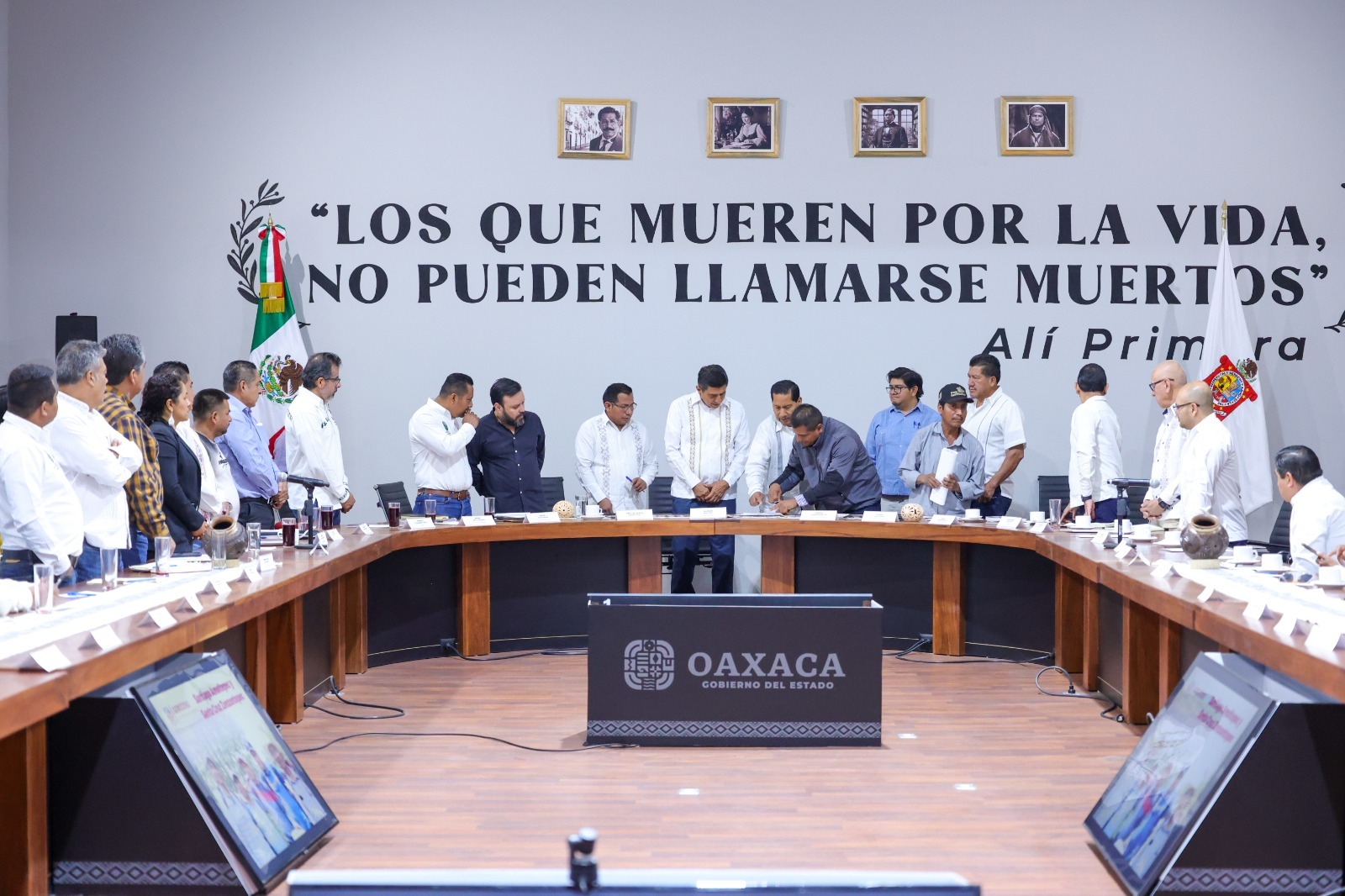 Durante este acto celebrado en el Salón Regeneración de Palacio de Gobierno, el Mandatario estatal celebró la voluntad de las autoridades de ambas comunidades para entablar este acuerdo que contribuye a la paz y la gobernabilidad del estado, así como al bienestar y desarrollo de los 17 mil 897 habitantes de estas comunidades.