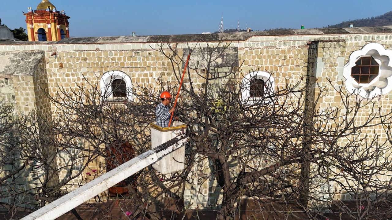 Oaxaca de Juárez, Oax. 01 de abril de 2025.- El Gobierno del Estado a través de la Secretaría de Medio Ambiente, Biodiversidad, Energías y Sostenibilidad realizó la poda fitosanitaria de los árboles emblemáticos ubicados en el atrio del templo de San Matías Jalatlaco, los cuales se encuentran catalogados desde el año 2009 como Árboles Notables en el Estado.