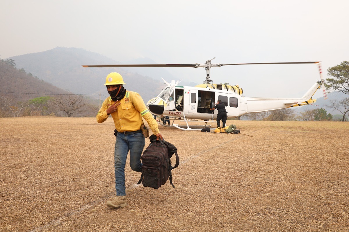 Vía aérea participa el helicóptero Bell UH-1H matrícula XA-UDZ para descargas de agua y traslado de equipo y brigadas.
