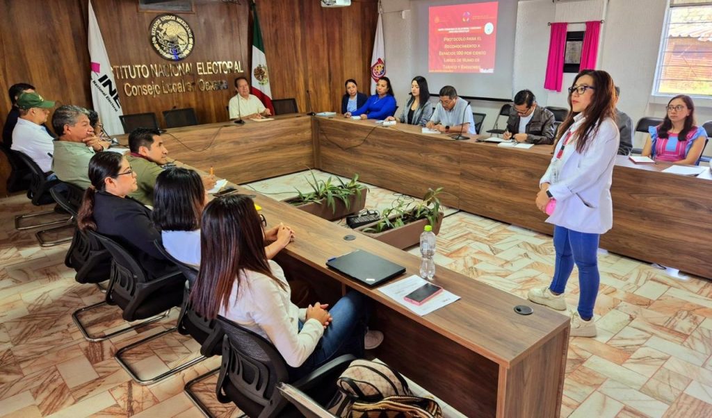 Oaxaca de Juárez, Oax. 28 de octubre de 2024.- Con el fin de crear entornos favorables al bienestar de la población, Servicios de Salud de Oaxaca (SSO) a través de la Jurisdicción Sanitaria 1 Valles Centrales, llevaron a cabo la capacitación al personal del Instituto Nacional Electoral (INE), para lograr la certificación como edificio libre de humo de tabaco en cada una de las sedes de 10 distritos electorales.