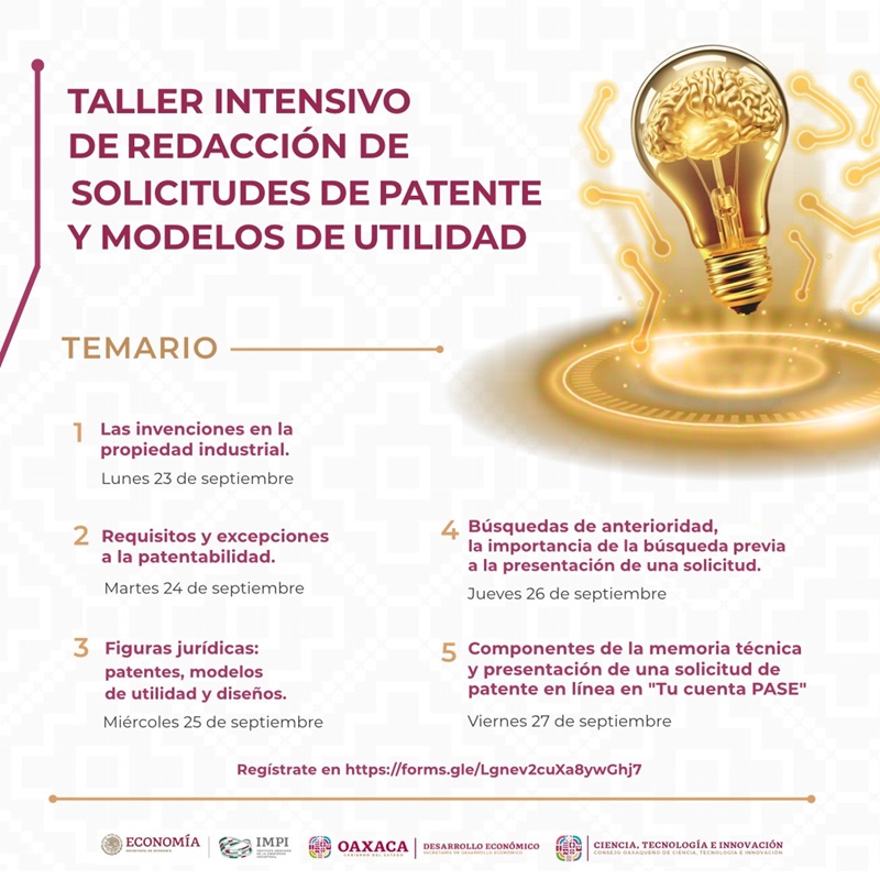 Oaxaca de Juárez, Oax. 12 de septiembre de 2024.- El Consejo Oaxaqueño de Ciencia, Tecnología e Innovación (Cocitei) en colaboración con la Secretaría de Desarrollo Económico (Sedeco), invitan a participar en el Taller Intensivo de Redacción de Solicitudes de Patente y Modelos de Utilidad, que se realizará de manera virtual del 23 al 27 de septiembre, en un horario de 11:00 a 13:00 horas.