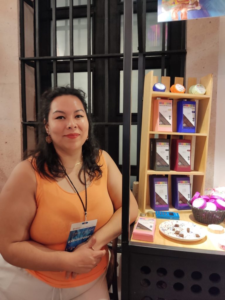 Elizabeth es originaria de Santa María del Tule, vende mole y chocolate artesanal en su empresa familiar “Demasiado Mexicano”; declaró que está muy contenta por participar en este importante evento que reúne a gente del país y el extranjero, pues cientos de personas que a diario recorren los stands de elaboraciones artesanales degustan la variedad que Elizabeth ofrece como chocolate con almendras, menta, flores, coco o con un ligero sabor a mole, alimento que también oferta al público.