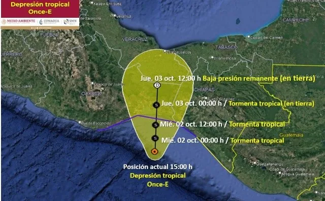 El servicio Meteorológico Nacional (SMN) alertó que la depresión Tropical Once-E se ubica frente a las costas de Oaxaca, sobre el occidente del golfo de Tehuantepec. Se prevé que se intensifique a tormenta tropical “Kristy” dejando lluvias torrenciales puntuales extraordinarias en Oaxaca y Chiapas.