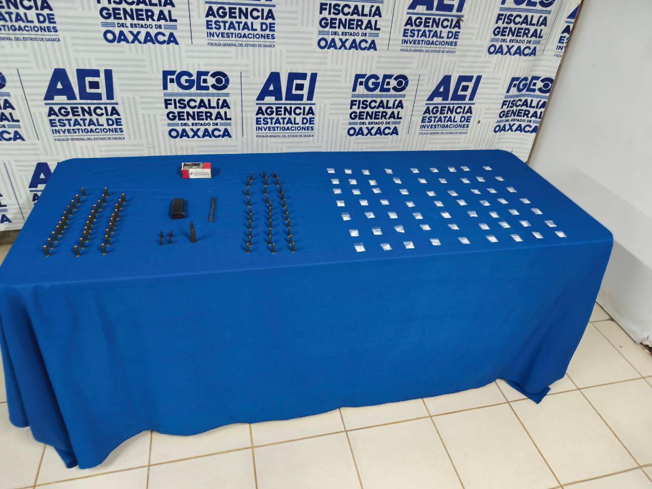 En Ayotzintepec, junto con la Fiscalía Especializada en Delitos de Alto Impacto de la FGEO, se decomisaron 63 bolsitas con presunto cristal, 69 cartuchos de distintos calibres, un cargador metálico y un resorte.