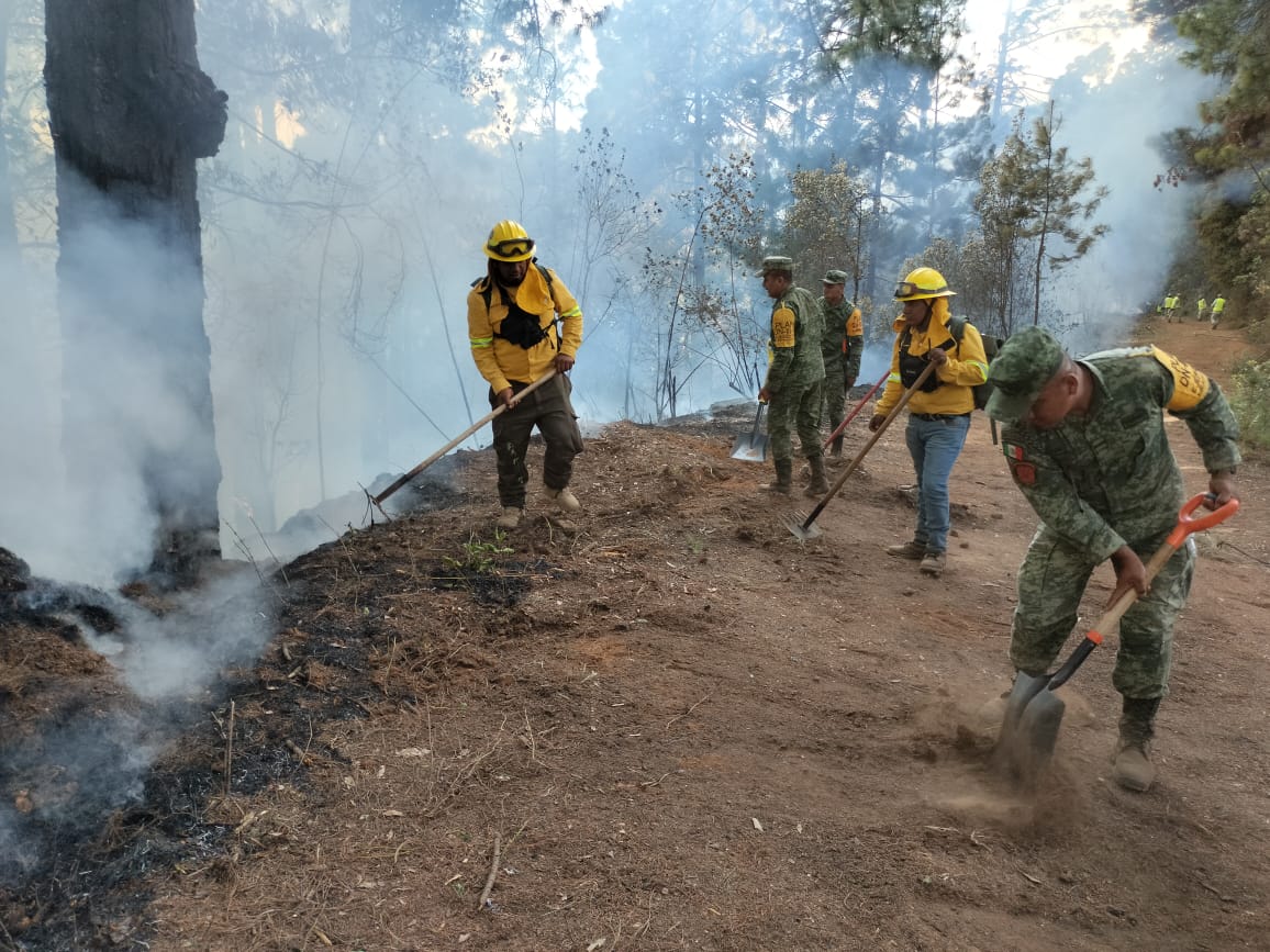 En este sentido, los trabajos de combate, control y liquidación del incendio forestal son reforzados por personal de la Secretaría de la Defensa Nacional (Sedena) y Guardia Nacional (GN).