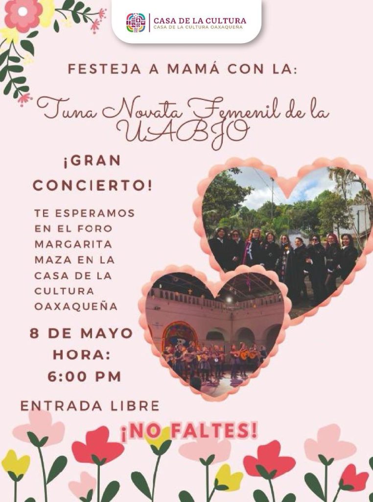 En el marco del Día de las Madres, en este mismo espacio cultural, el jueves 8, a las 18:00 horas, se realizará el concierto “Festeja a mamá con la: Tuna Novata Femenil de la UABJO” para deleitar al público con canciones al ritmo de instrumentos de cuerda y percusión, característicos del estilo.