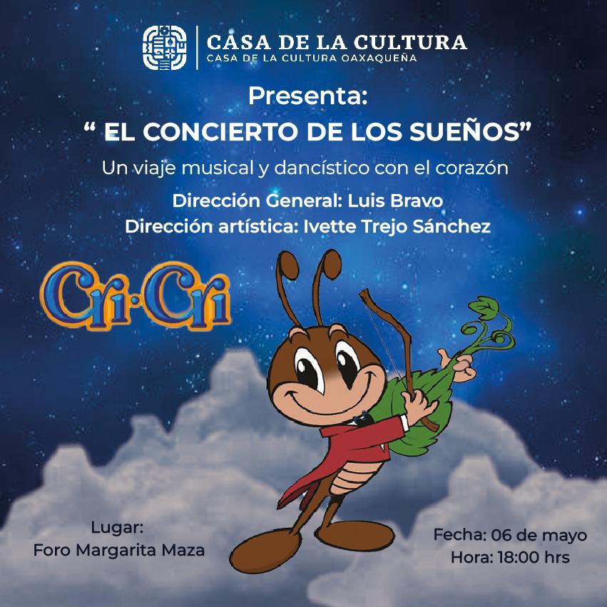 Oaxaca de Juárez, Oax. 2 de mayo de 2025.- La Casa de la Cultura Oaxaqueña (CCO), invita a «El Concierto de los sueños. Un viaje musical y dancístico con el corazón de Cri-Cri”, que presentará este martes 6 de mayo, a las 18:00 horas, en su Foro “Margarita Maza Parada”.