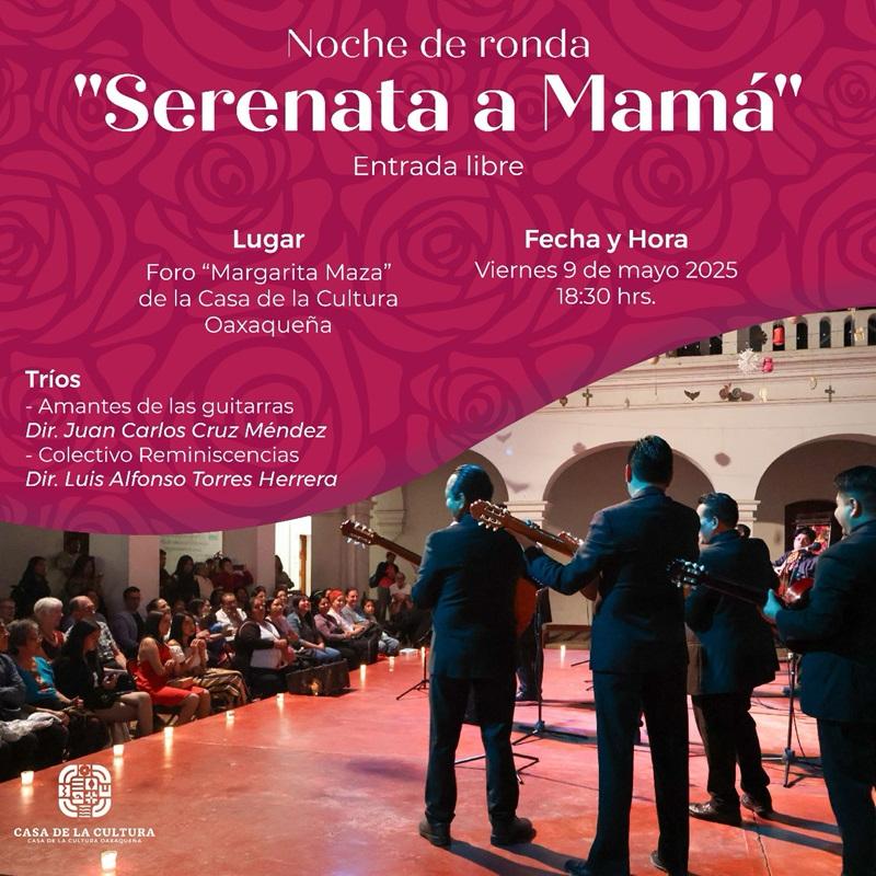 Asimismo, el viernes 9, a las 18:30 horas, en el mismo foro “Margarita Maza Parada”, los tríos Amantes de las Guitarras, dirigido por Juan Carlos Méndez y el Colectivo Reminiscencias, encabezado por Luis Alfonso Torres Herrera, presentarán en el programa Noche de ronda “Serenata a Mamá”, que con este estilo musical se interpretarán temas populares.