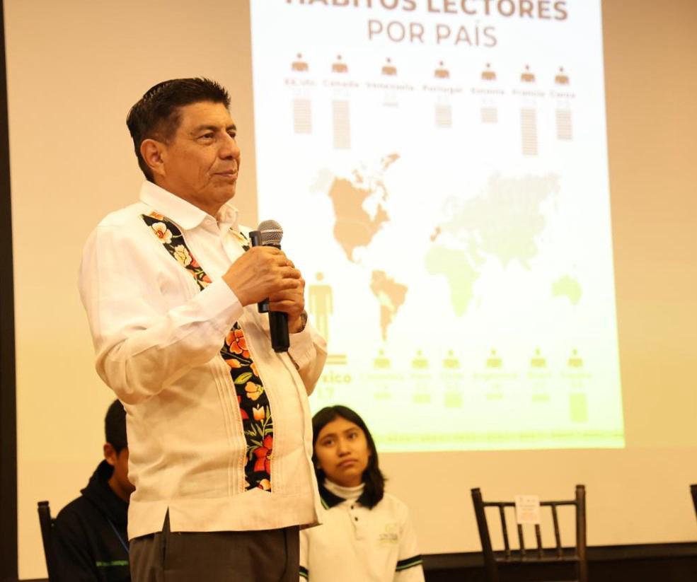 El Mandatario estatal les explicó la necesidad de formar un hábito de lectura en la población, para superar la actual estadística que señala a las y los mexicanos de leer solo 1.2 libros al año.
