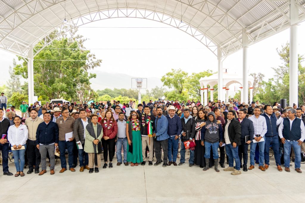 Luego de inaugurar el techado de la cancha municipal, que fue realizado por la administración estatal, el Mandatario oaxaqueño destacó que en su gobierno se trabaja junto con las autoridades de las comunidades para revertir el rezago social, mantener la paz y brindar mejores condiciones de bienestar social.