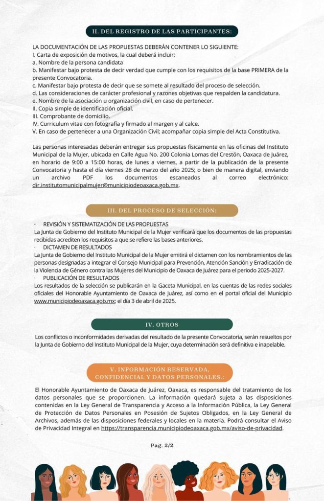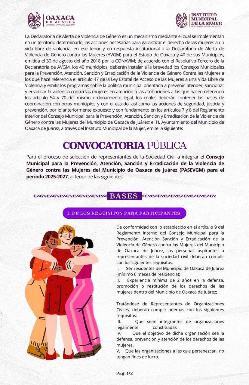 Oaxaca de Juárez, Oax. 27 de marzo de 2025.- El Gobierno Municipal de Oaxaca de Juárez, encabezado por el Presidente Municipal Ray Chagoya, a través del Instituto Municipal de la Mujer, mantiene abierta la convocatoria para la integración del Consejo Municipal para la Prevención, Atención, Sanción y Erradicación de la Violencia de Género contra las Mujeres (PASEVGM) para el periodo 2025-2027.