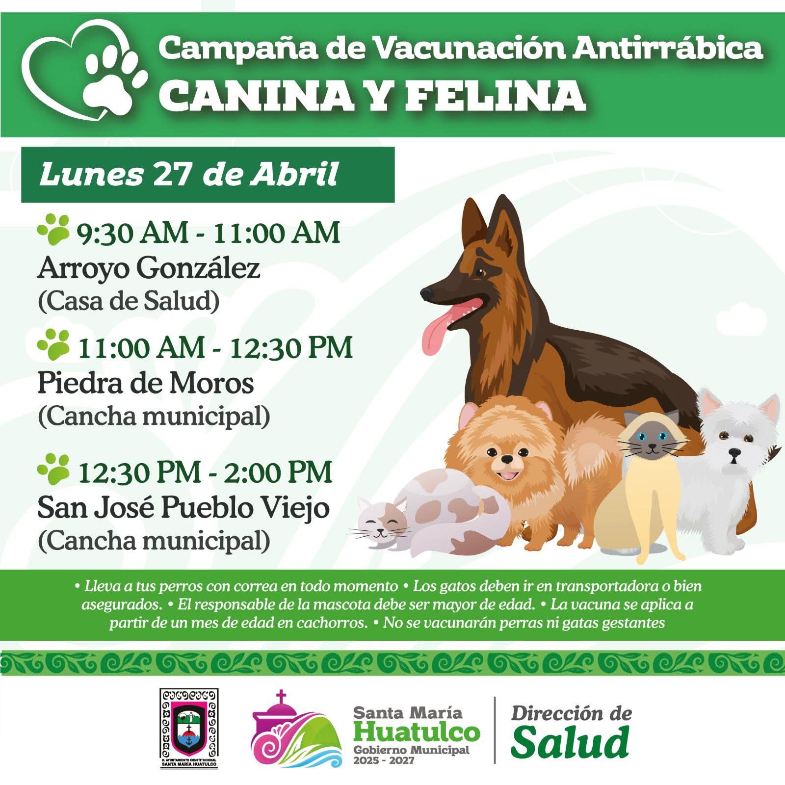 El Gobierno Municipal de Santa María Huatulco, que preside el Ing. Julio Cárdenas, a través de la Dirección de Salud, informa a la ciudadanía que continúan las jornadas de vacunación antirrábica en diversas comunidades del municipio.