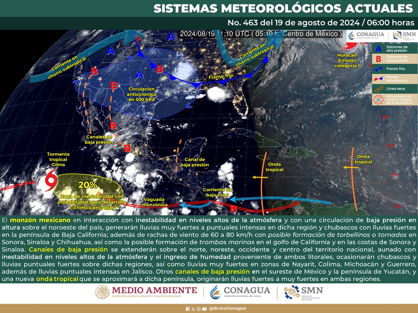 De acuerdo con el pronóstico emitido por la Comisión Nacional del Agua (Conagua) estas precipitaciones se generan por la afluencia de humedad del Océano Pacífico y canales de baja presión sobre el interior del país, apoyados por condiciones de inestabilidad.