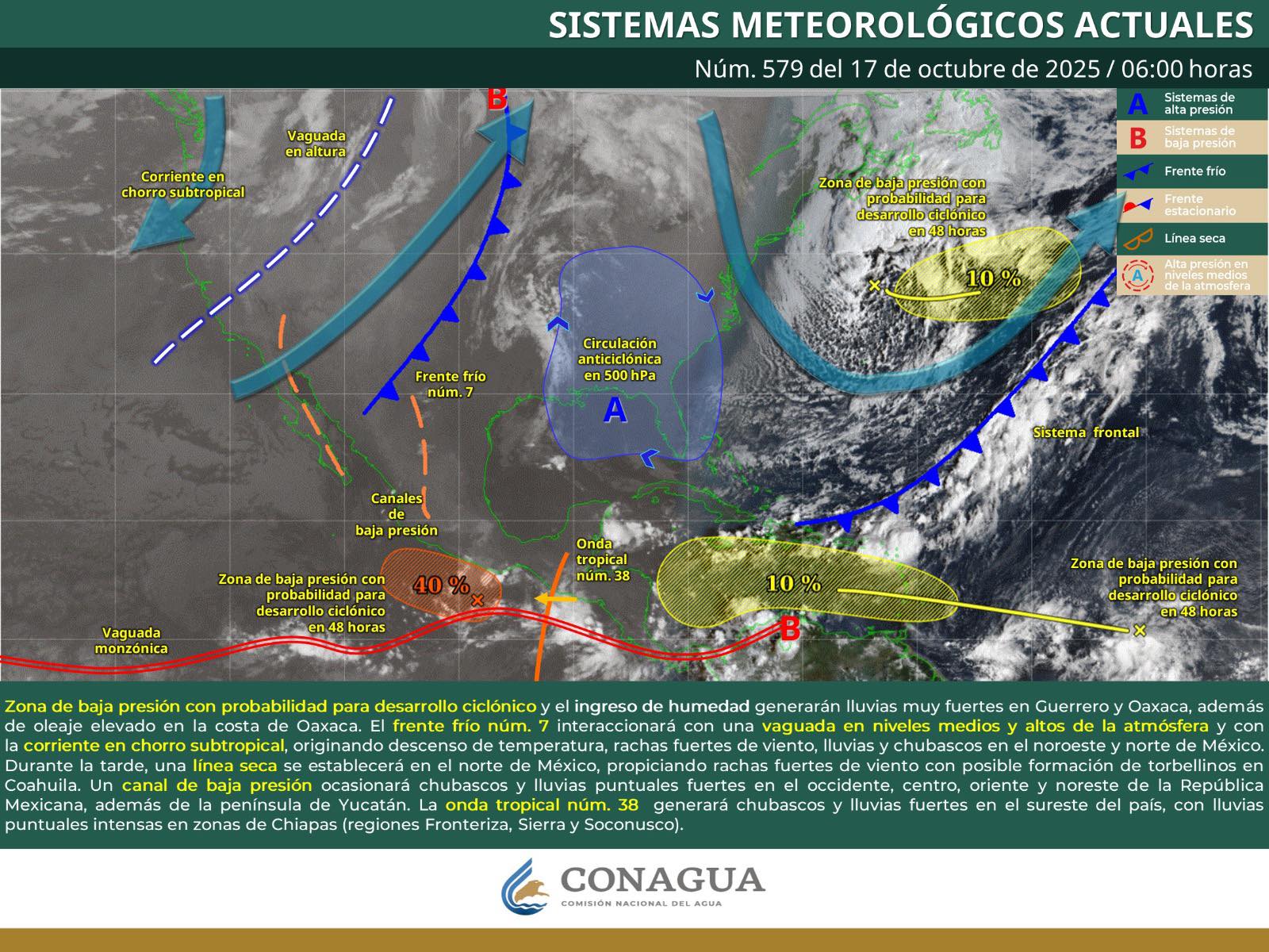 De acuerdo con el pronóstico del tiempo emitido por la Comisión Nacional del Agua (Conagua), estas condiciones son derivadas de una zona de baja presión con potencial para desarrollo ciclónico, ubicada al sur de Oaxaca y Guerrero, asociada a la vaguada monzónica.