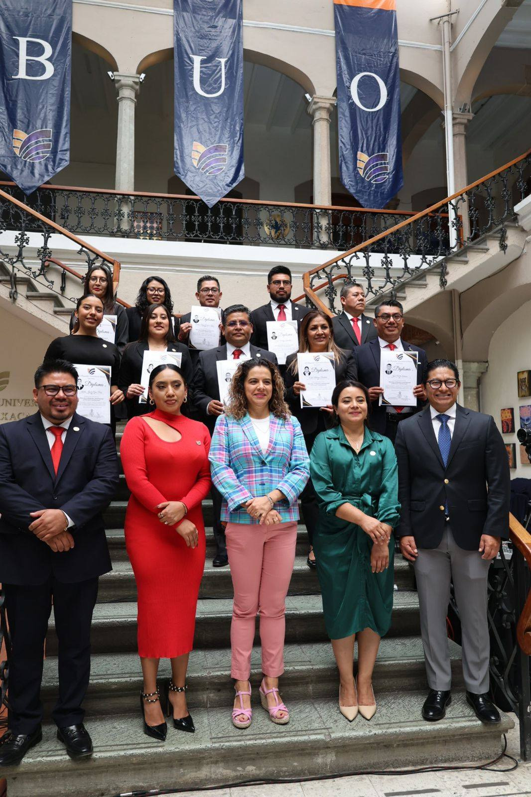 En el marco de la ceremonia, acompañada del rector de la BUO, David Zabdiel Martínez Pérez; de la directora general de Licenciaturas y Posgrados, Adabelia Peláez García y del magistrado Moisés Molina Reyes, presidente de la Sala Constitucional del Tribunal Superior de Justicia y coordinador honorario de la Maestría, entregó diplomas a las y los egresados y les felicitó por este esfuerzo.