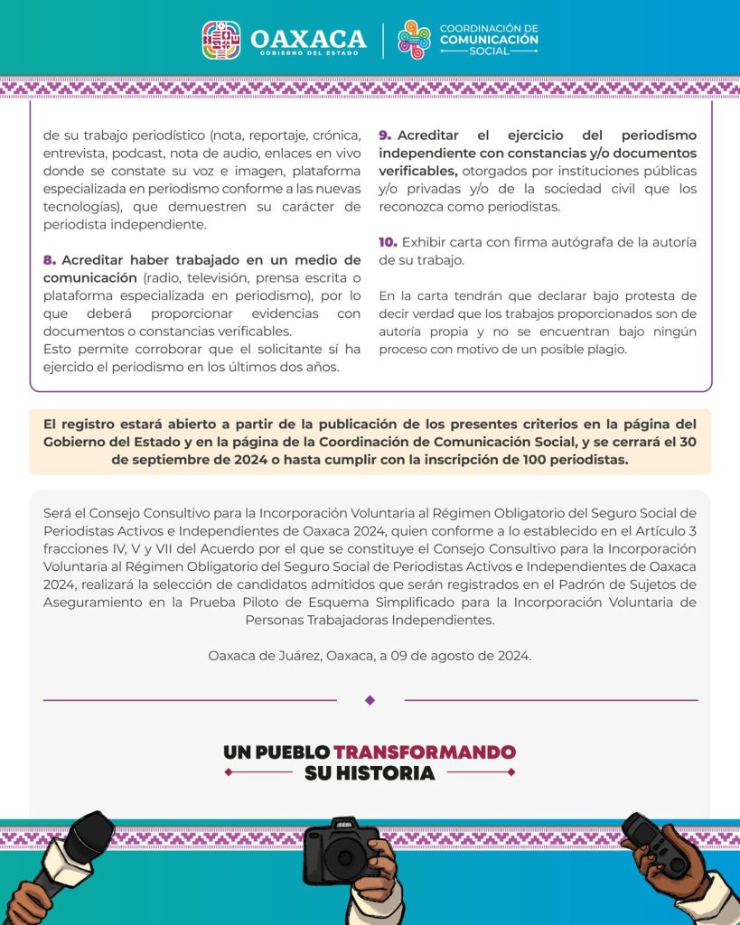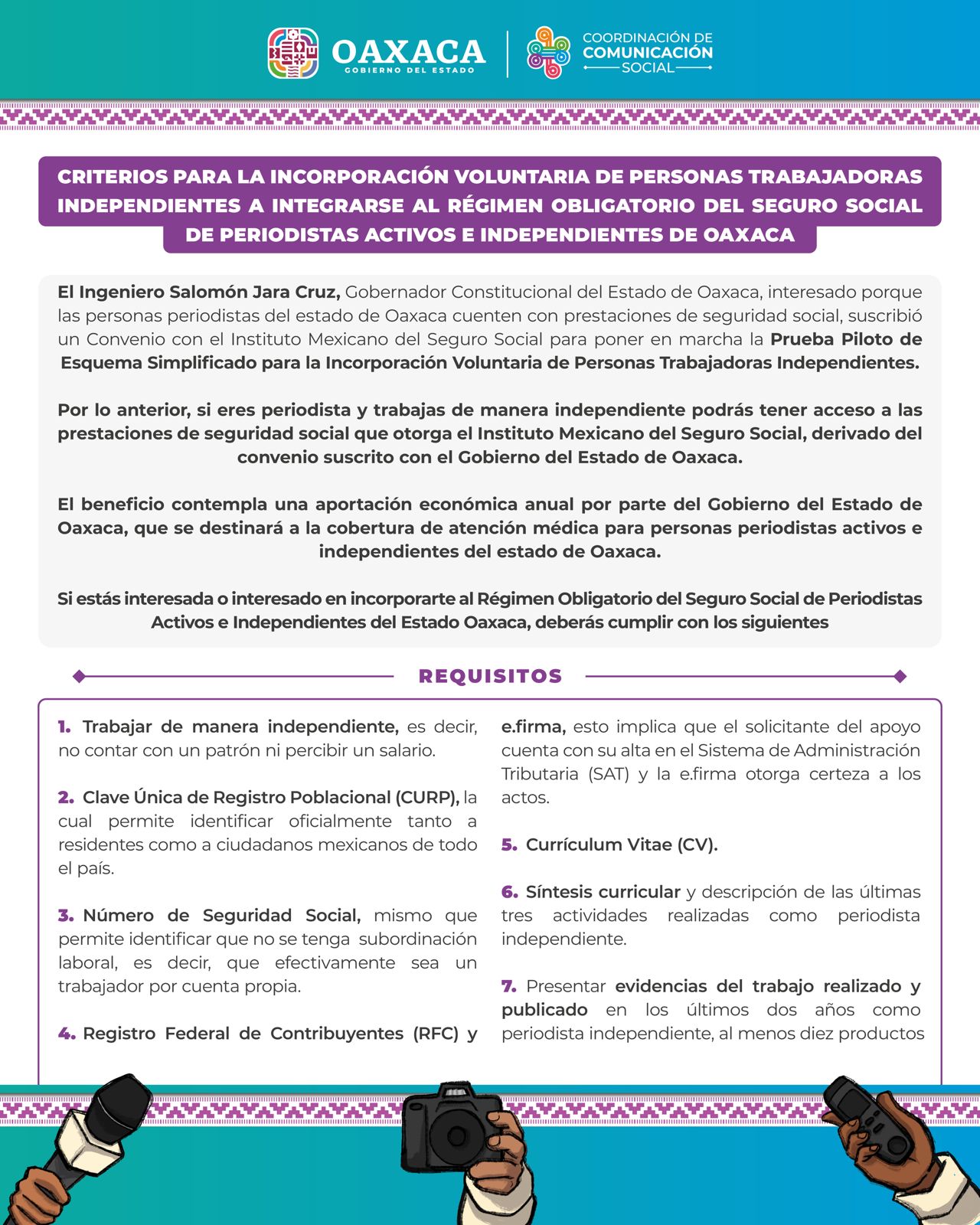 Oaxaca de Juárez, Oax. 12 de agosto de 2024.- La Coordinación de Comunicación Social del Gobierno del Estado dio a conocer los requisitos para que las y los periodistas independientes de la entidad formen parte de la Prueba Piloto de Esquema Simplificado para la Incorporación Voluntaria de Personas Trabajadoras Independientes.