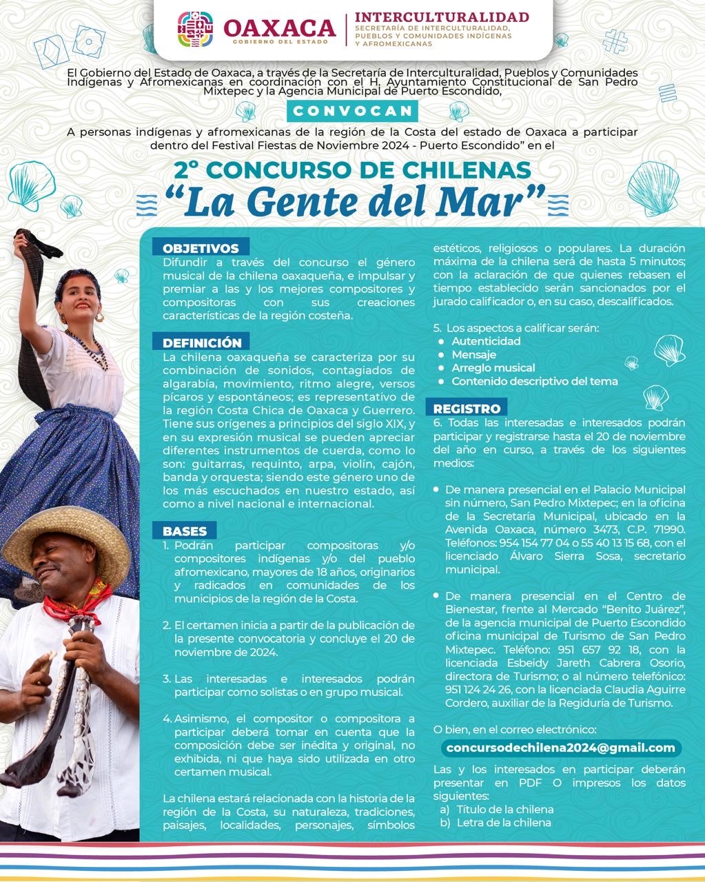 Tlalixtac de Cabrera, Oax. 12 de noviembre de 2024.- El Gobierno del Estado de Oaxaca, a través de la Secretaría de Interculturalidad, Pueblos y Comunidades Indígenas y Afromexicanas (SIPCIA) invita a participar en el Primer Concurso de “Poesías a mi Costa», el Segundo Concurso de Chilenas «La Gente del Mar» y el Primer Concurso de Leyendas «Los Relatos de mi Pueblo Costeño».