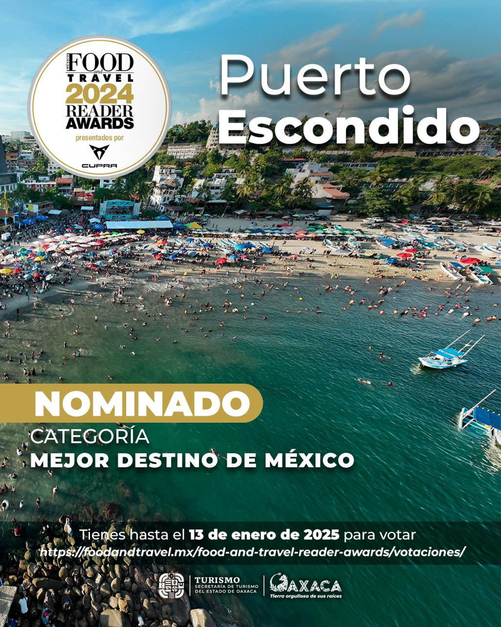 Asimismo, Puerto Escondido está nominado como Mejor destino de México y Oaxaca como Mejor Destino Gastronómico de México, además de restaurantes, hoteles y experiencias turísticas.