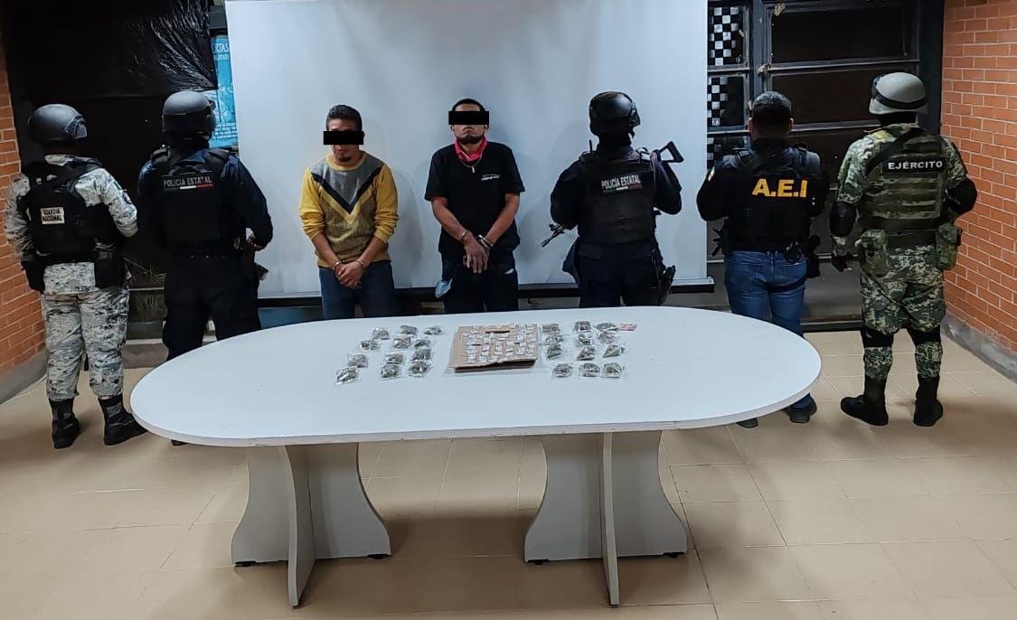 En el lugar, los elementos de seguridad detuvieron a dos personas del sexo masculino identificados como L.A.B.S y L.C., quienes fueron presentados ante la autoridad competente por el delito contra la salud en su modalidad de narcomenudeo.