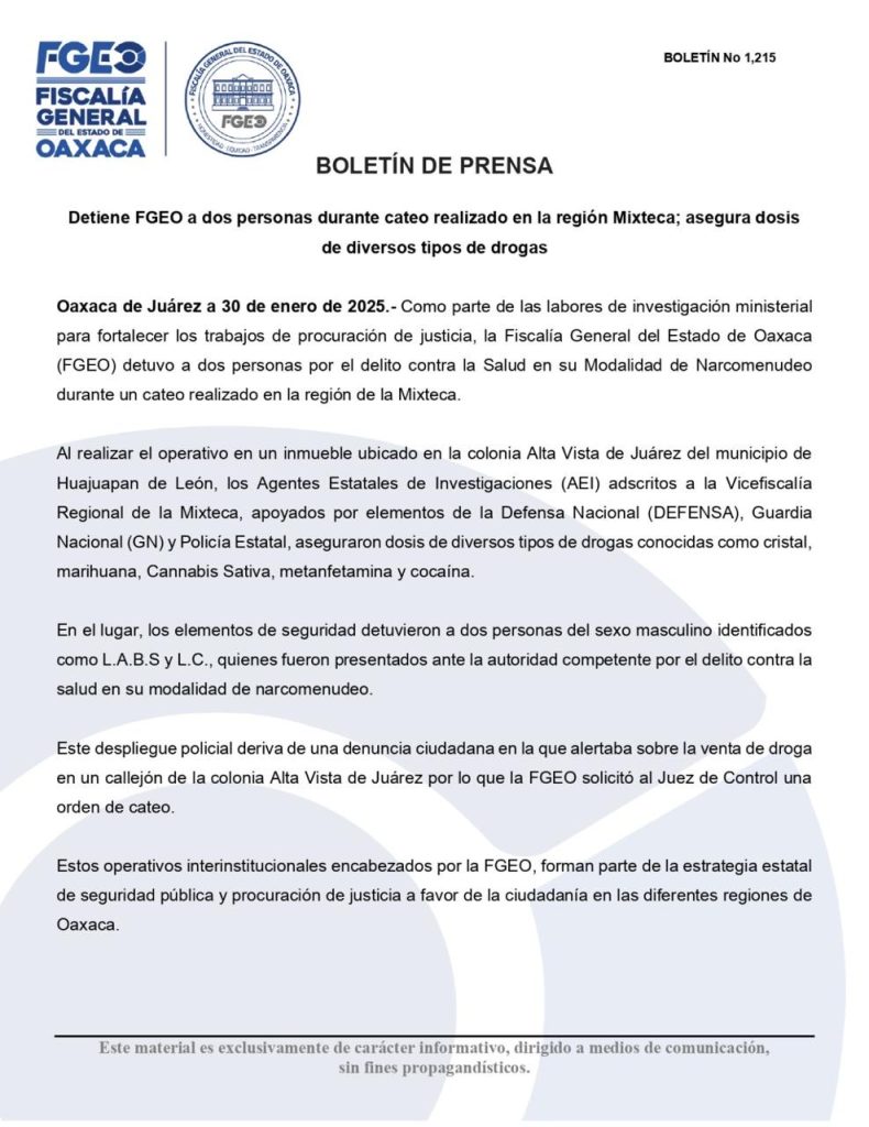 Oaxaca de Juárez a 30 de enero de 2025.- Como parte de las labores de investigación ministerial para fortalecer los trabajos de procuración de justicia, la Fiscalía General del Estado de Oaxaca (FGEO) detuvo a dos personas por el delito contra la Salud en su Modalidad de Narcomenudeo durante un cateo realizado en la región de la Mixteca.