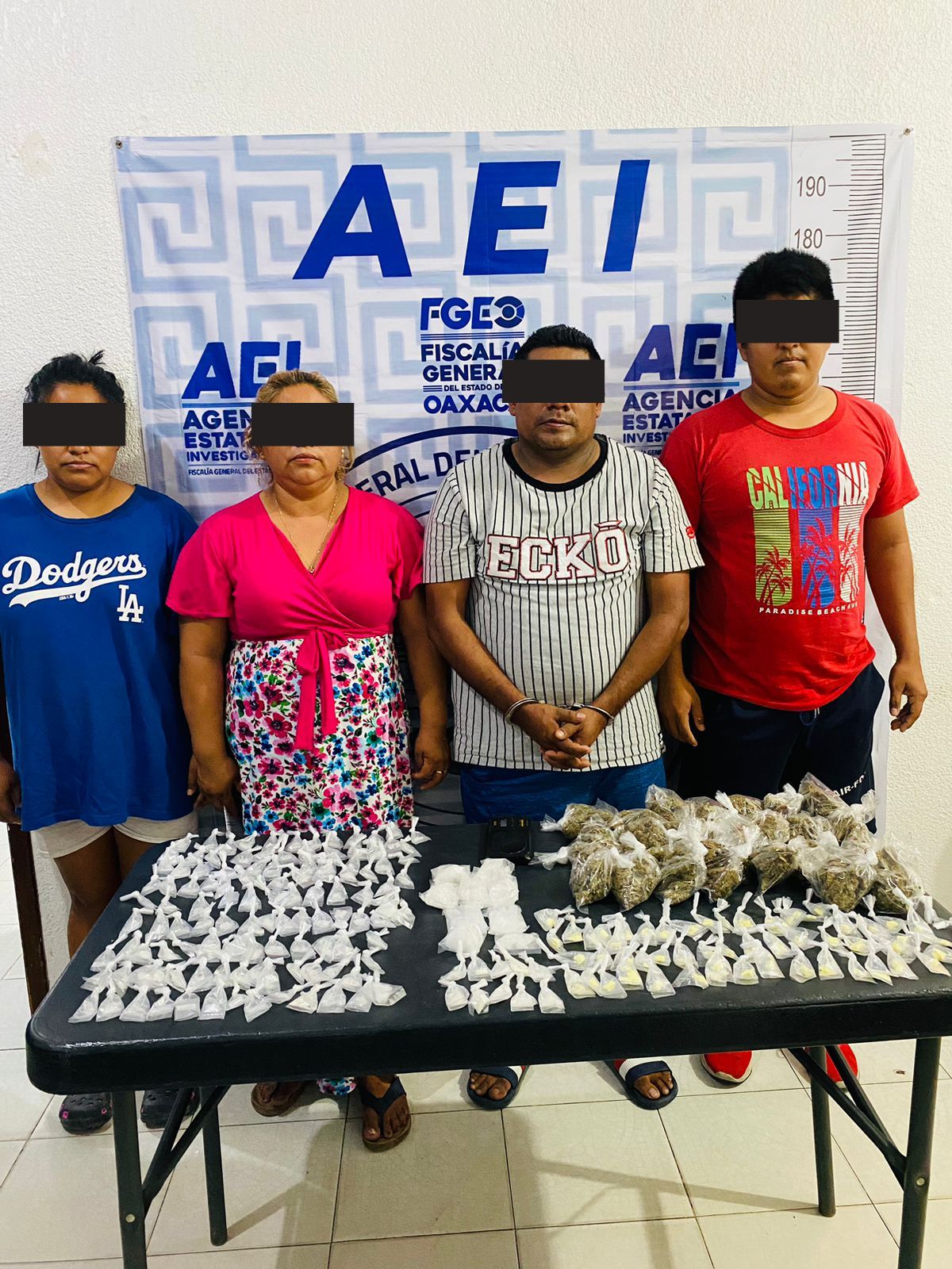 El primer operativo se realizó en un domicilio de la colonia Costa Verde del municipio de San Blas Atempa, donde los elementos de la Agencia Estatal de Investigaciones (AEI) aseguraron diversas bolsas con cristal, cocaína y hierba seca con las características de la marihuana, así como diversos cartuchos útiles, además de un vehículo, logrando la detención de cuatro personas identificadas como N.R.M., J.E.V.V., A.M.C., y R.R.S.