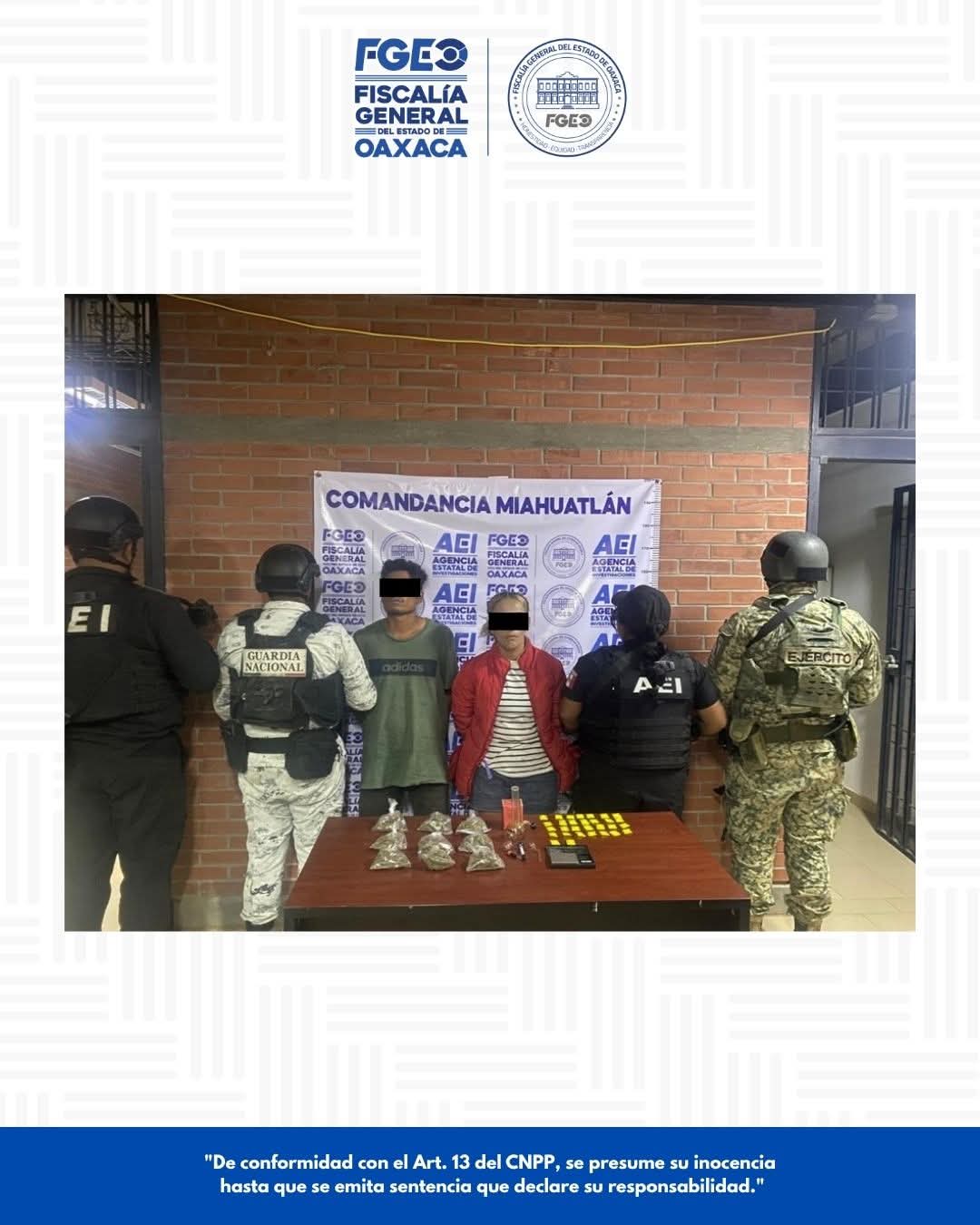 Estas acciones judiciales fueron encabezadas por la FGEO, a través de la Vicefiscalía Regional de Valles Centrales y la Agencia Estatal de Investigaciones (AEI), en coordinación con la Secretaría de la Defensa Nacional (DEFENSA) y la Guardia Nacional (GN), en tres inmuebles ubicados en el municipio de Miahuatlán de Porfirio Díaz, como parte de investigaciones por delitos contra la salud en su modalidad de narcomenudeo en su hipótesis de comercio de metanfetamina y canabis sativa.