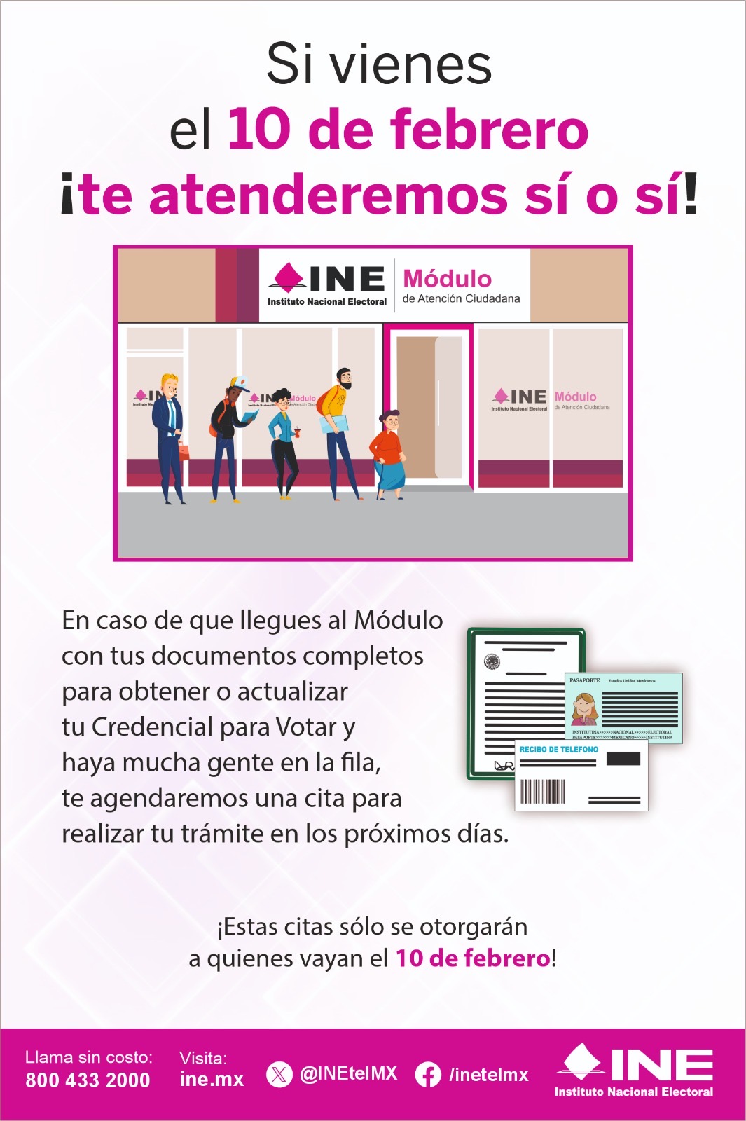 Los Módulos de Atención Ciudadana abrirán el fin de semana y atenderán con o sin citaEl Instituto Nacional Electoral (INE) informa que el próximo lunes 10 de febrero es la fecha límite para realizar algún trámite de actualización de la Credencial para Votar con Fotografía.