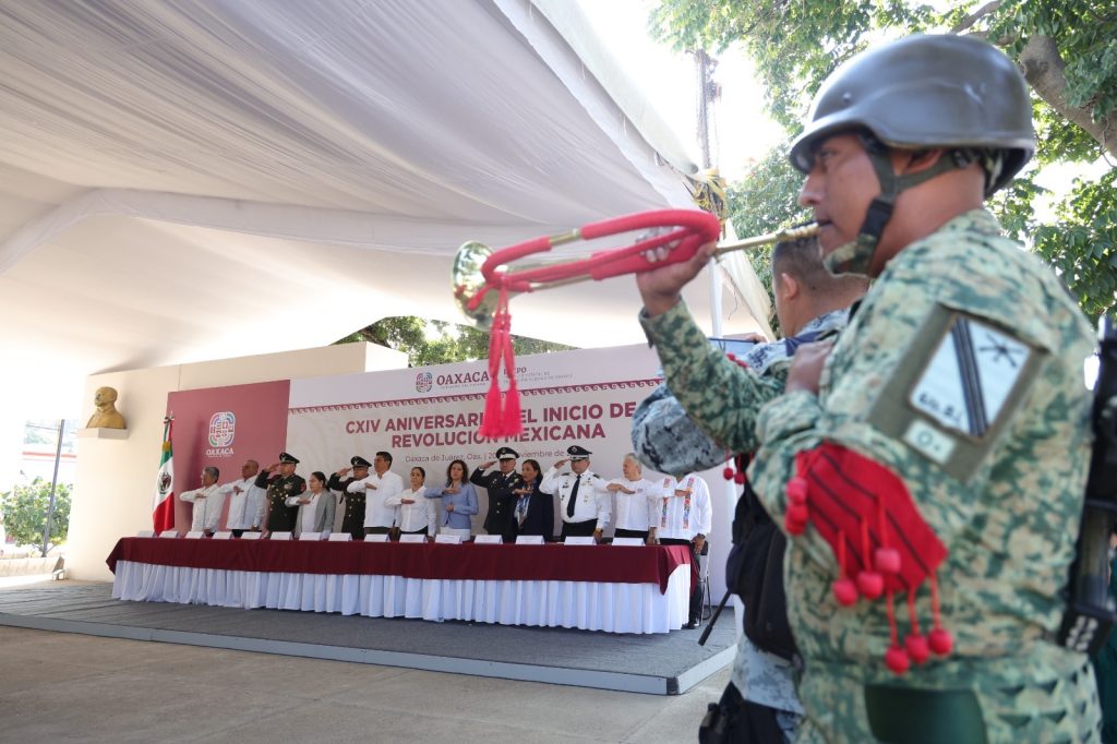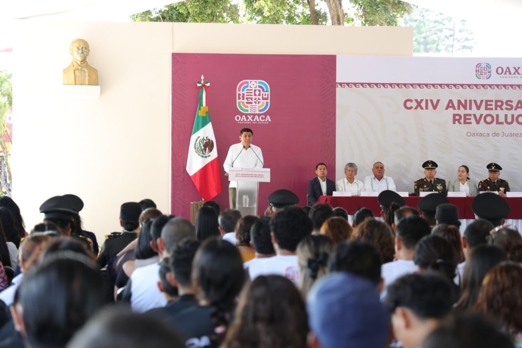 En un acto cívico realizado en el Jardín Madero de la capital oaxaqueña, el Mandatario estatal señaló que los esfuerzos de las y los caudillos del movimiento social de 1910 se ven reflejados en las reformas constitucionales del país, que permiten a la ciudadanía vivir libremente y decidir el rumbo de la nación.