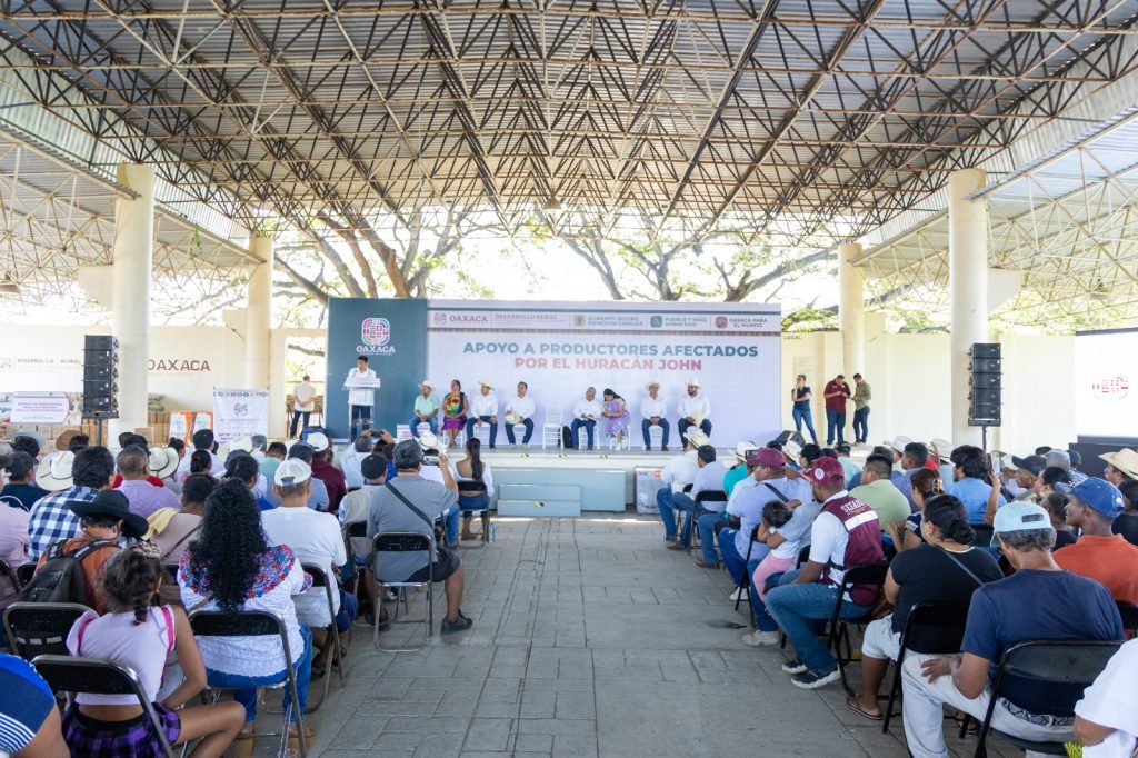 Santiago Pinotepa Nacional, Oax. 12 de octubre de 2024.- El Gobernador Salomón Jara Cruz encabezó la entrega de apoyos y equipo a personas damnificadas agropecuarias de la región Costa, luego de las pérdidas de cultivos y ganado en esta zona tras el paso del Huracán John.