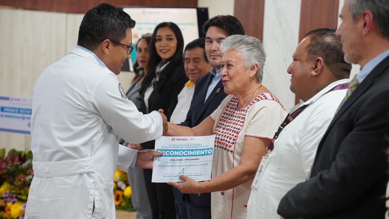 Aunado a ello, entregó reconocimientos por su labor destacada a los residentes Roberto Cabrera Cariño y Élmer Iván Ruiz Franco; en la categoría de pasantes a Daniel López Ramírez y Dulce Teresa Vásquez Cartas, y finalmente a médicos internos de pregrado María Fernanda Hernández Ziga, Omar Erubiel Martínez Montes.