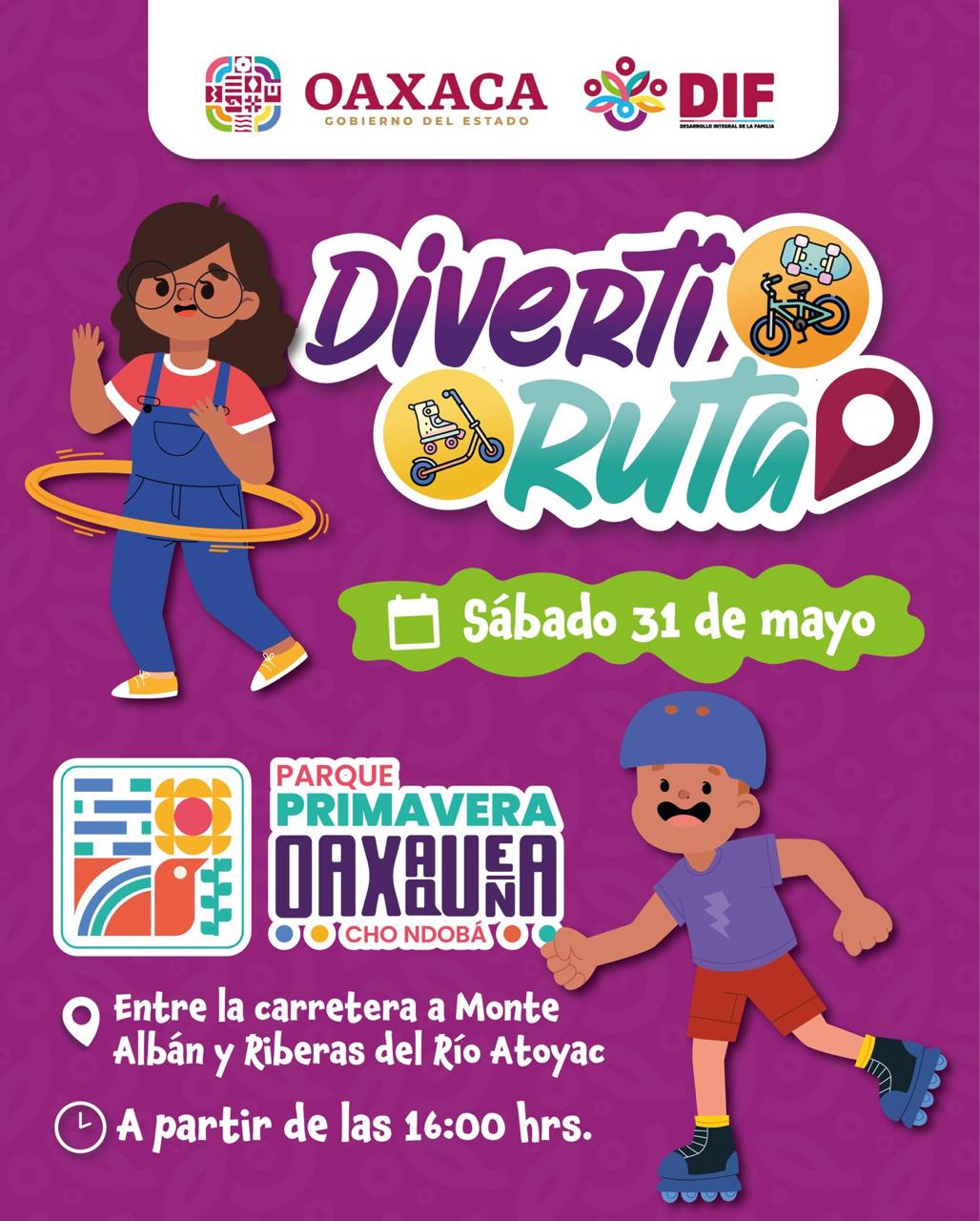 Oaxaca de Juárez, Oax., 28 de mayo de 2025.- Este sábado 31 de mayo se llevará a cabo la trigésima séptima edición de la Diverti Ruta en el Parque Primavera Oaxaqueña Cho Ndobá, en un horario de 16:00 a 19:00 horas por invitación del Sistema para el Desarrollo Integral de la Familia (DIF) Oaxaca.