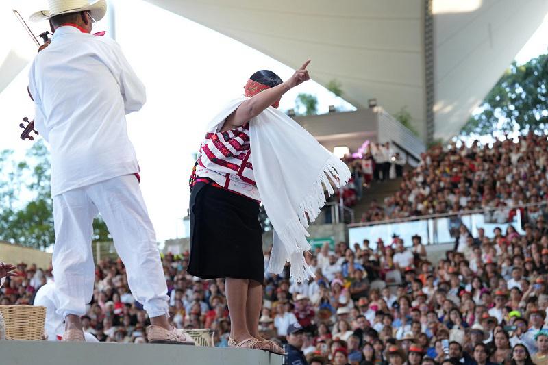 En tanto, la picardía de Santa María Huatulco, con sones y chilenas, fue acompañada por las luces de celulares del público, quien vivió el cerramiento de la palabra por San Pablo Villa de Mitla; San Pedro Ixcatlán, con Na Puta Chichí y la Borrachita con sus pasos sincronizados y balanceo rítmico; Santa María Zacatepec, con boda, fandango y carnaval Tacuate, cuyos hombres pintados de rojo bailaron con un torito a cuestas.