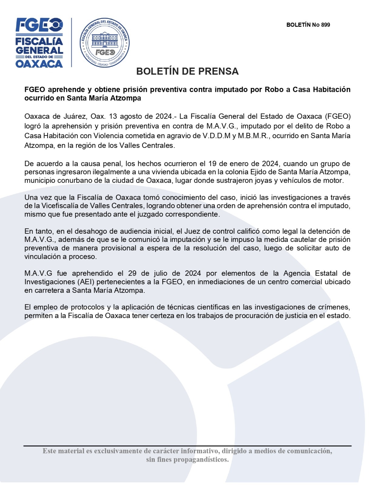 Oaxaca de Juárez, Oax. 13 agosto de 2024.- La Fiscalía General del Estado de Oaxaca (FGEO) logró la aprehensión y prisión preventiva en contra de M.A.V.G., imputado por el delito de Robo a Casa Habitación con Violencia cometida en agravio de V.D.D.M y M.B.M.R., ocurrido en Santa María Atzompa, en la región de los Valles Centrales.