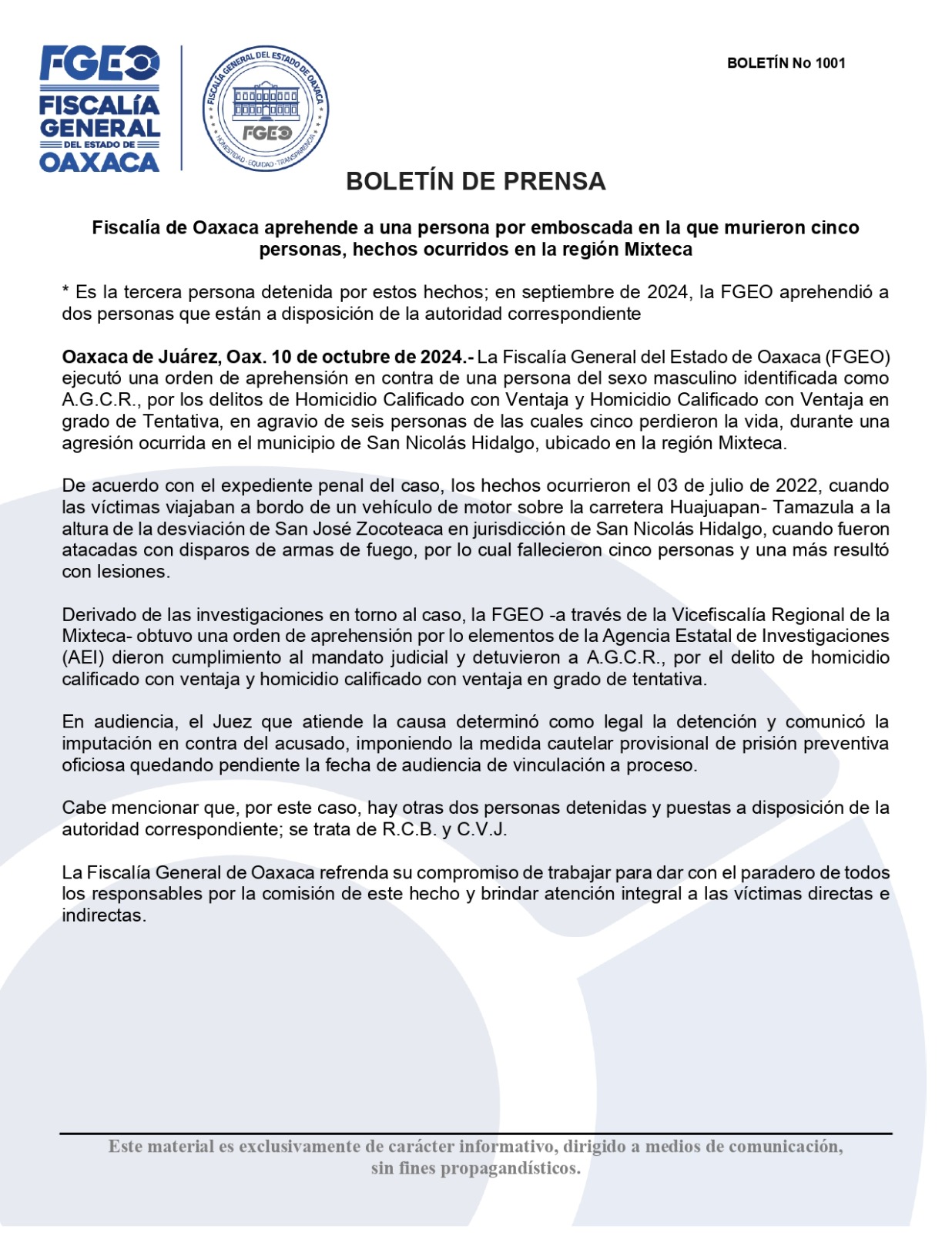 La Fiscalía General de Oaxaca refrenda su compromiso de trabajar para dar con el paradero de todos los responsables por la comisión de este hecho y brindar atención integral a las víctimas directas e indirectas.