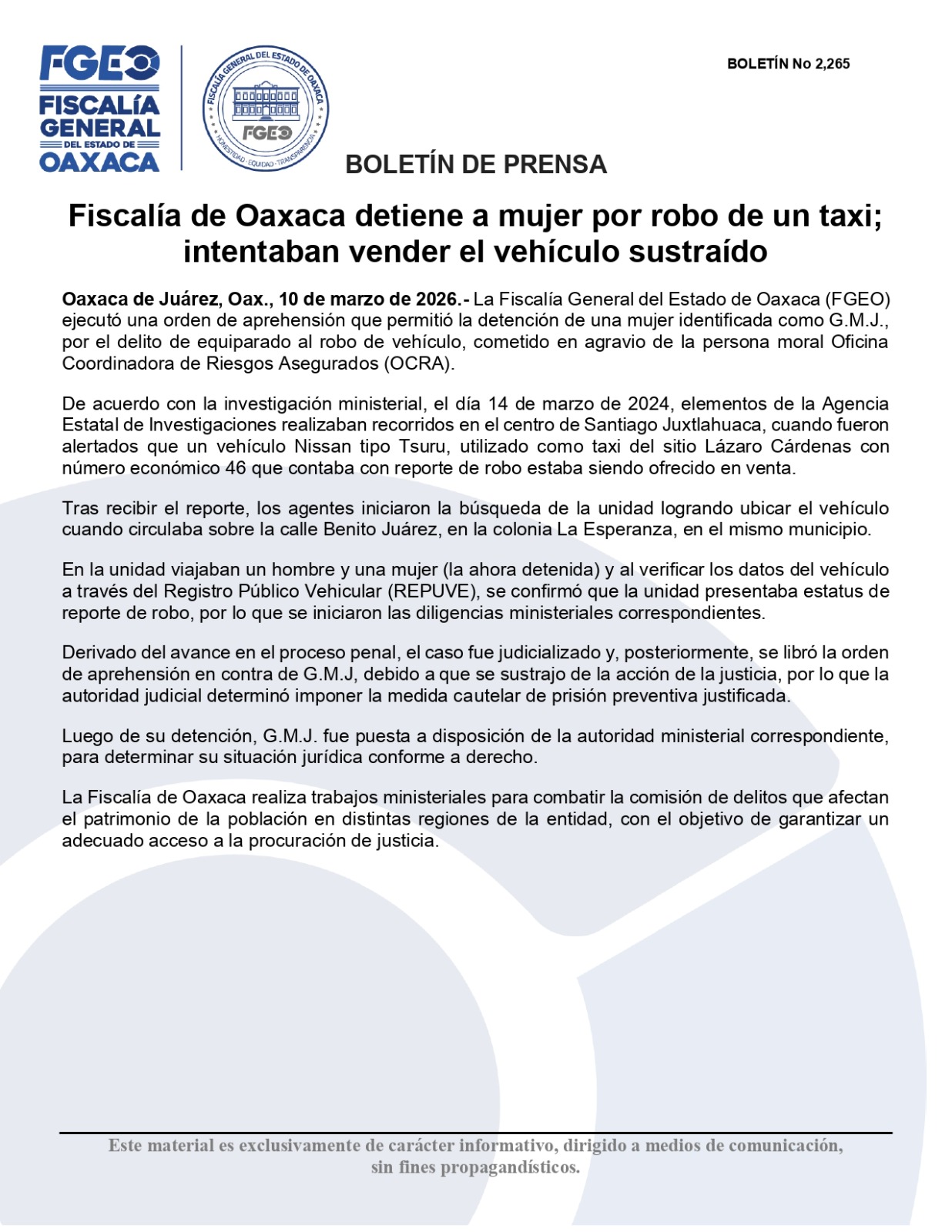 Oaxaca de Juárez, Oax., 10 de marzo de 2026.- La Fiscalía General del Estado de Oaxaca (FGEO) ejecutó una orden de aprehensión que permitió la detención de una mujer identificada como G.M.J., por el delito de equiparado al robo de vehículo, cometido en agravio de la persona moral Oficina Coordinadora de Riesgos Asegurados (OCRA).
