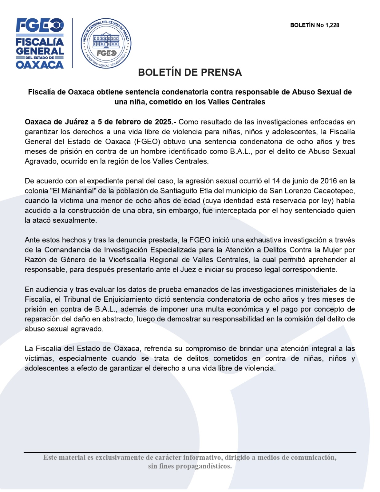 Oaxaca de Juárez a 5 de febrero de 2025.- Como resultado de las investigaciones enfocadas en garantizar los derechos a una vida libre de violencia para niñas, niños y adolescentes, la Fiscalía General del Estado de Oaxaca (FGEO) obtuvo una sentencia condenatoria de ocho años y tres meses de prisión en contra de un hombre identificado como B.A.L., por el delito de Abuso Sexual Agravado, ocurrido en la región de los Valles Centrales.
