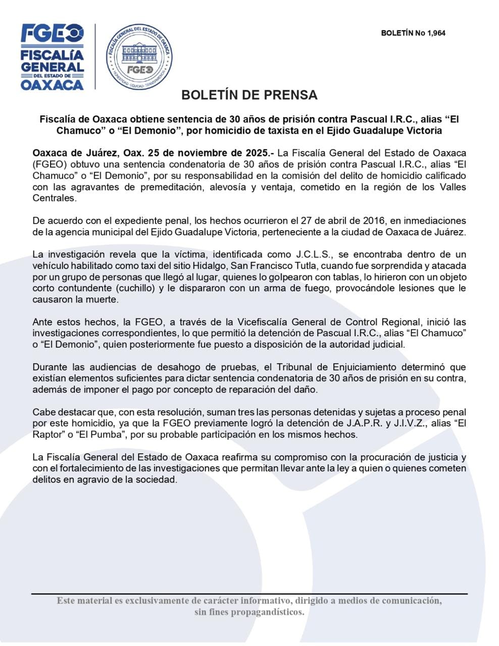 Oaxaca de Juárez, Oax. 25 de noviembre de 2025.- La Fiscalía General del Estado de Oaxaca (FGEO) obtuvo una sentencia condenatoria de 30 años de prisión contra Pascual I.R.C., alias “El Chamuco” o “El Demonio”, por su responsabilidad en la comisión del delito de homicidio calificado con las agravantes de premeditación, alevosía y ventaja, cometido en la región de los Valles Centrales.