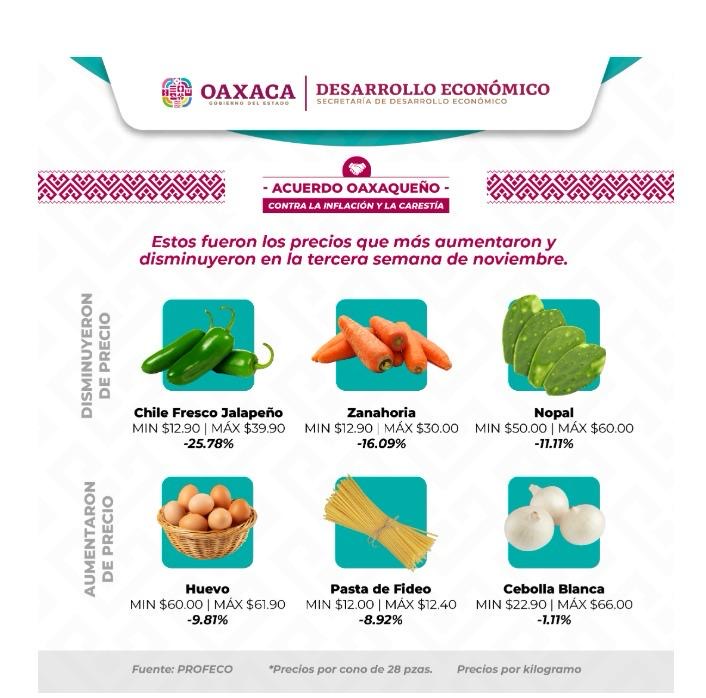 • Mediante la liga https://seie.oaxaca.gob.mx/canasta se informará los cambios en el costo de los 24 alimentos seleccionados y considerados en listados de Profeco, Banxico y Coneval