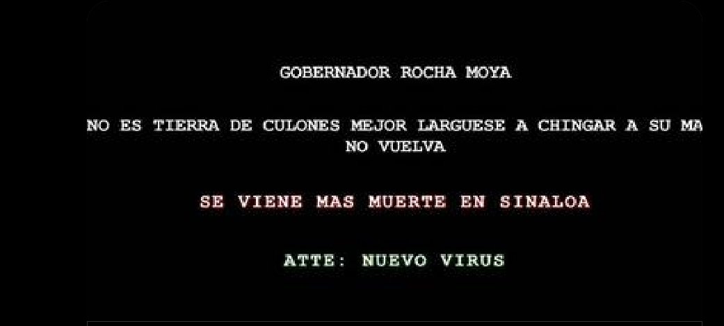 El mensaje, firmado por un grupo autodenominado ‘Nuevo Virus’, apareció en la página principal del sitio y contenía amenazas directas: “Culones, mejor lárguense a chingar a su madre y no vuelvan. Se viene más muerte en Sinaloa”.