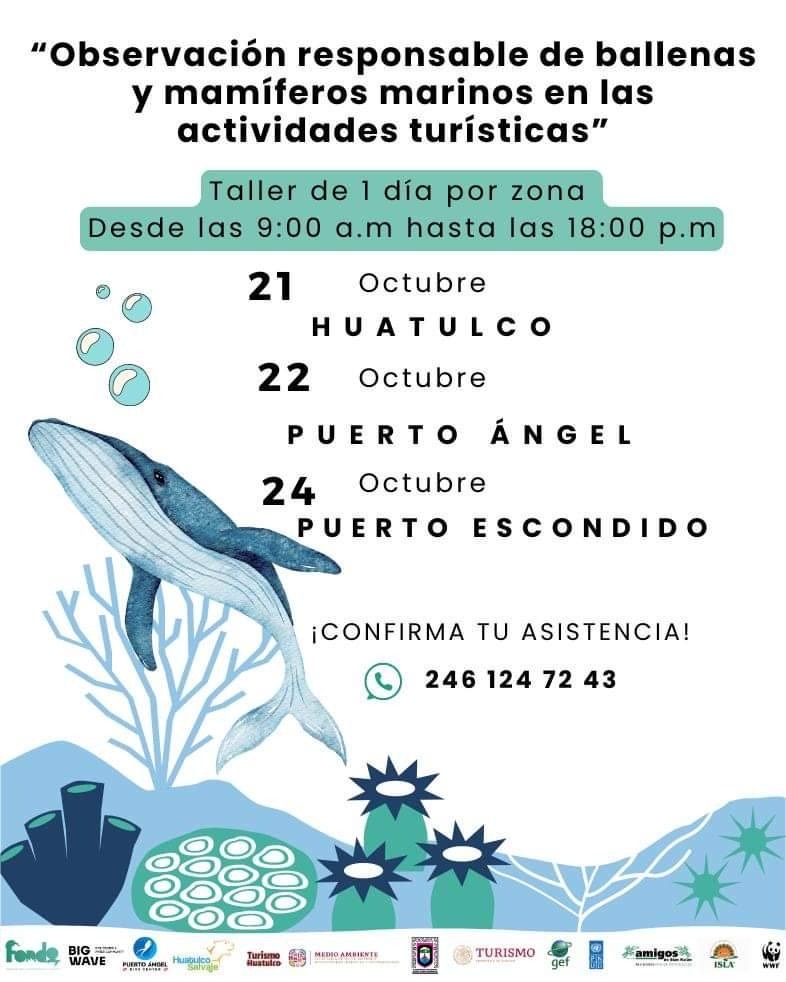 El taller, dirigido a quienes se desempeñan como capitanes de embarcaciones, guías turísticos, monitores comunitarios y operadores turísticos que ofrecen tours de avistamiento de ballenas y mamíferos marinos, tendrá un día de duración, en Bahías de Huatulco, Puerto Ángel y Puerto Escondido.