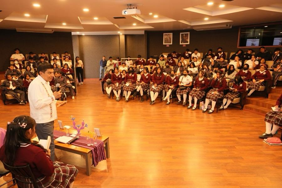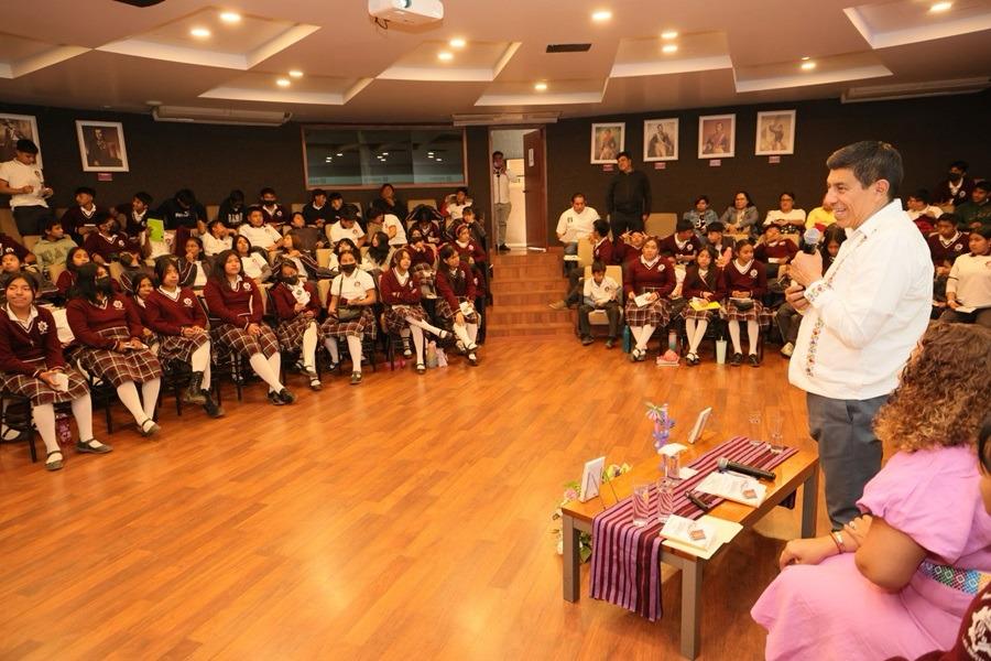 Oaxaca de Juárez, Oax. 4 de marzo de 2025.- Un diálogo entre la literatura y la transformación social fue encabezado por el Gobernador Salomón Jara Cruz, al que acudieron 108 adolescentes de la escuela secundaria técnica 278 de San Agustín Yatareni; como parte del programa Fomento a la Lectura, Un pueblo leyendo para transformar su historia.