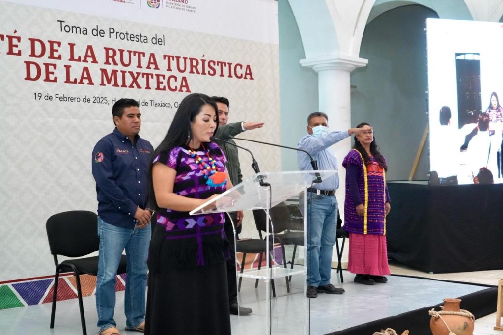 Heroica Ciudad de Tlaxiaco, Oax. 20 de febrero de 2025.- La secretaria de Turismo estatal, Saymi Pineda Velasco tomó protesta a los presidentes municipales de nueve municipios, integrantes del Comité de la Ruta Turística de la Mixteca, quienes impulsarán las políticas y acciones para detonar el flujo turístico, que convierta a esta actividad en el motor de desarrollo económico y social de los pueblos de esa región.