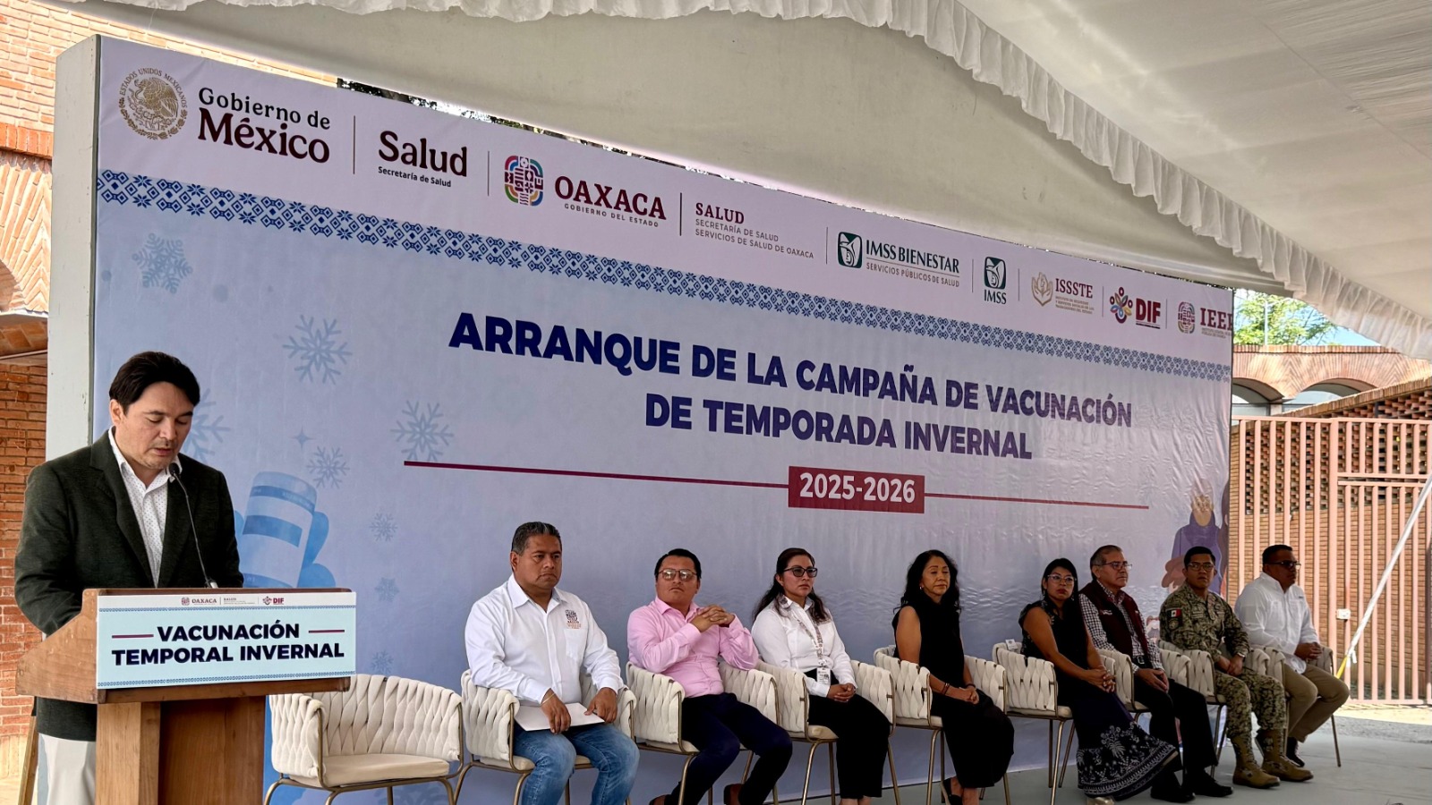 En presencia del coordinador del IMSS-Bienestar Oaxaca, Jesús Alejandro Ramírez Figueroa y representantes de las instituciones de salud, el titular de SSO subrayó que el biológico es una herramienta probada, segura y eficaz para prevenir complicaciones graves durante la temporada invernal.