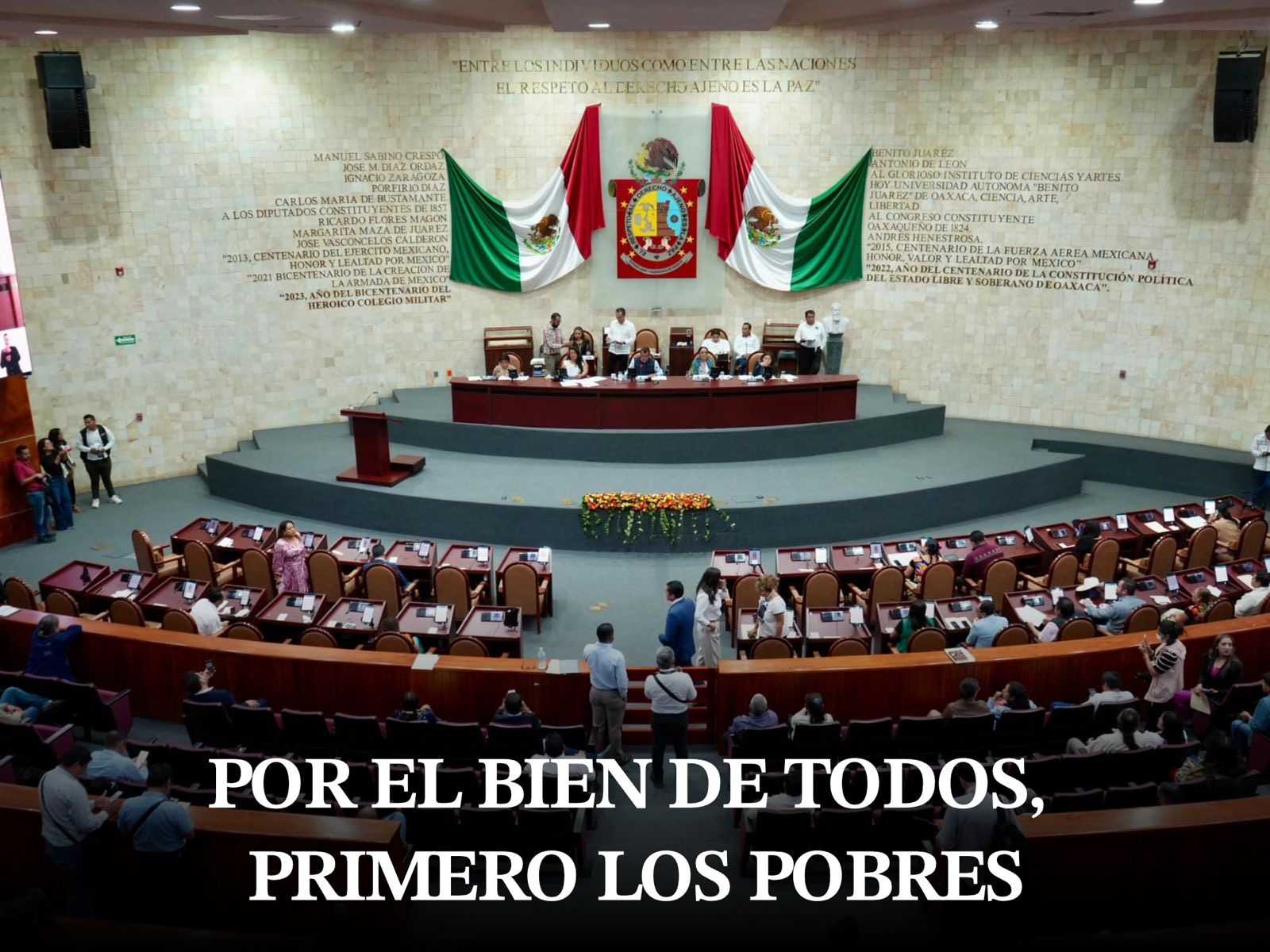 ¡Por el bien de todos, primero los pobres!», frase que instituyera el Presidente Andrés Manuel López Obrador (AMLO), será inscrita con letras de oro en el muro de sesiones del pleno del Congreso del Estado de Oaxaca, como un reconocimiento a su trabajo realizado en estos seis años.