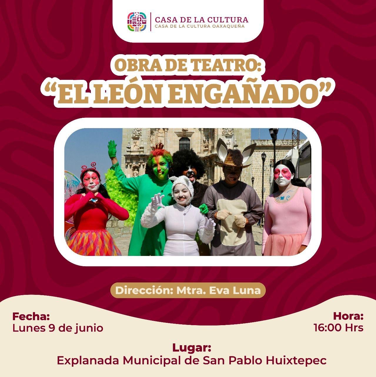 El 9 de junio, a las 16:00 horas, en la explanada municipal de San Pablo Huixtepec se presentará la obra “El león engañado”, dirigida a niñas y niños e interpretada por el Grupo Representativo de Teatro “Cuarta Pared” de la CCO. La pieza teatral está basada en una fábula de la colección literaria Panchatantra, originaria de la India.
